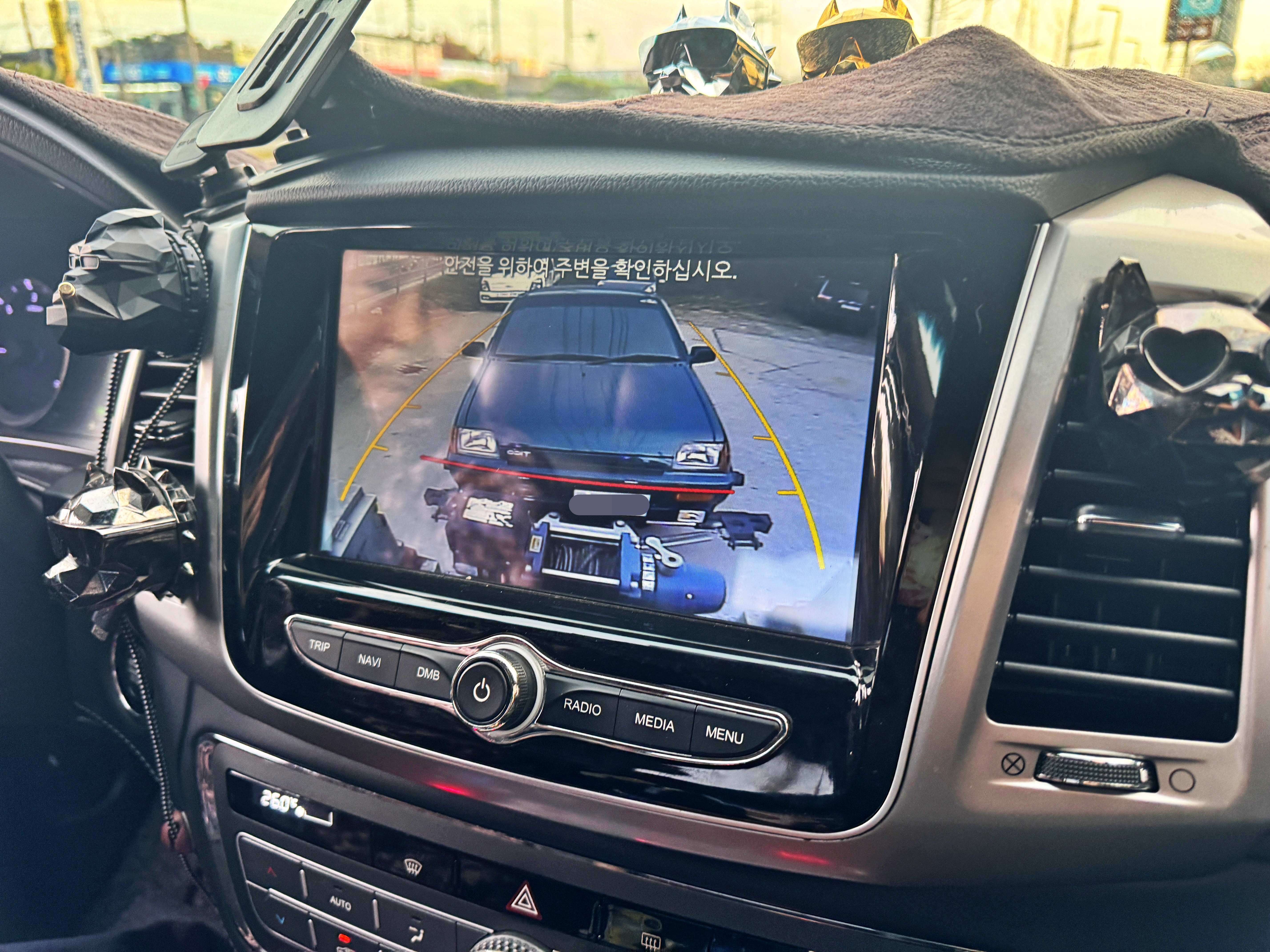 조수석에 타서 렉스턴스포츠 렉카의 후방카메라로 견인되는 티코의 모습을 봅니다.