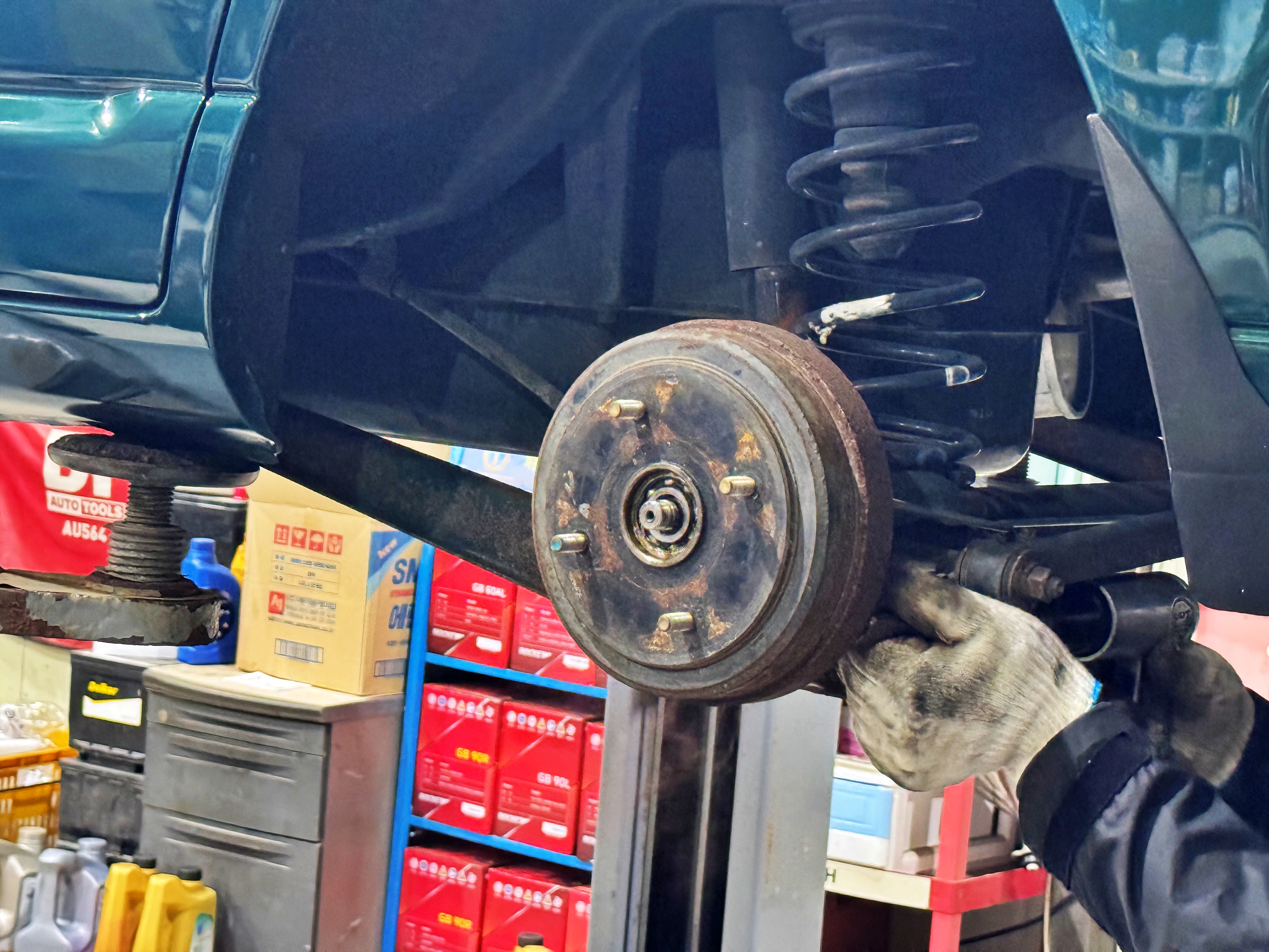 그렇게 차를 올리고 점검하는데 운전석 뒷바퀴가 잘 돌아가지 않더군요.