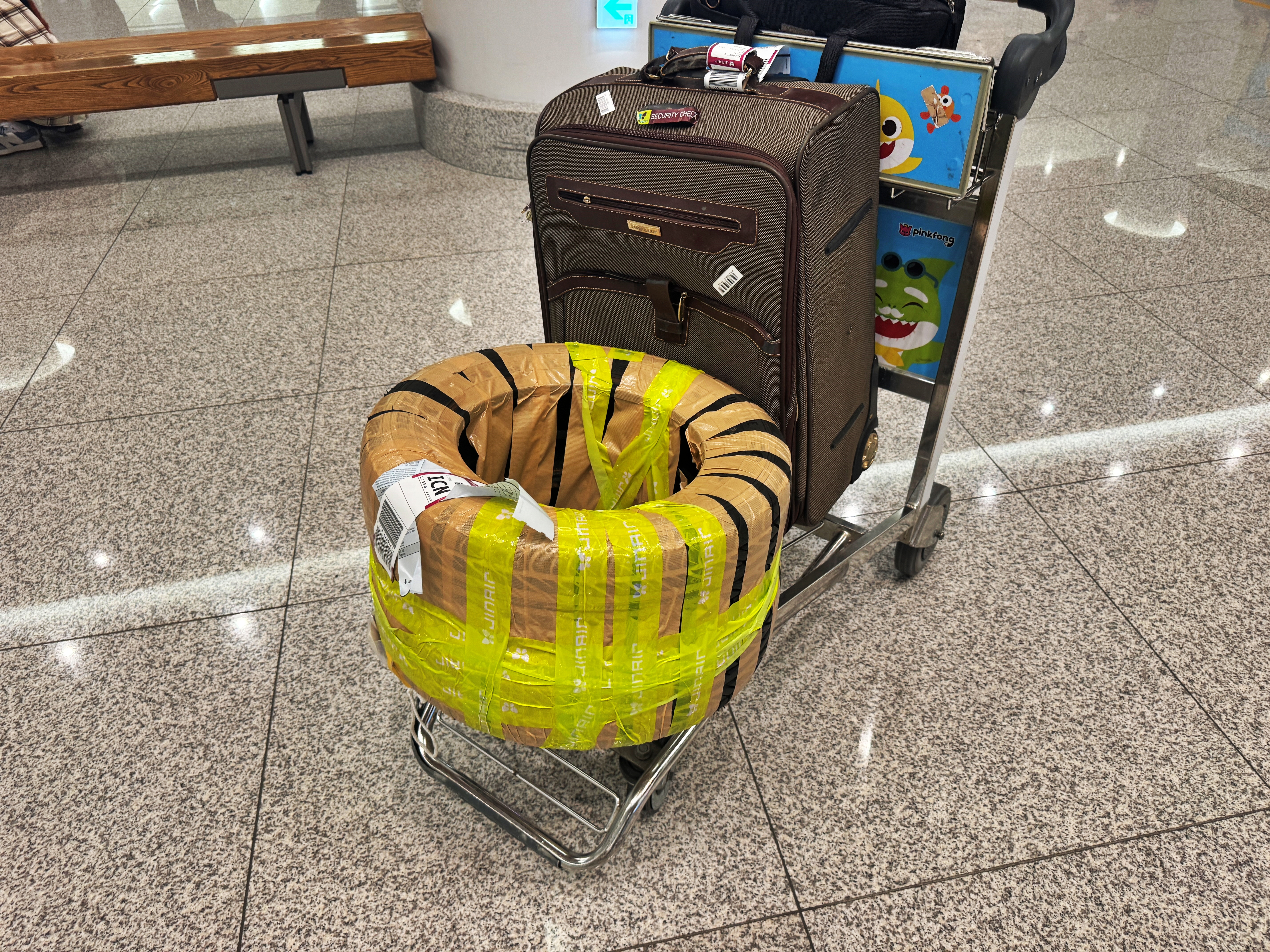 캐리어 아니면 골프백정도나 볼 수 있는 곳에서 타이어가 튀어나오니 다들 타이어가 있다고 신기하게 보네요. 일본까지 가서 타이어를 사 오는 사람을 처음 보시는지 모르겠지만... 그런 시선을 즐기며 캐리어와 함께 타이어 카트에 싣고 공항을 빠져나갑니다.