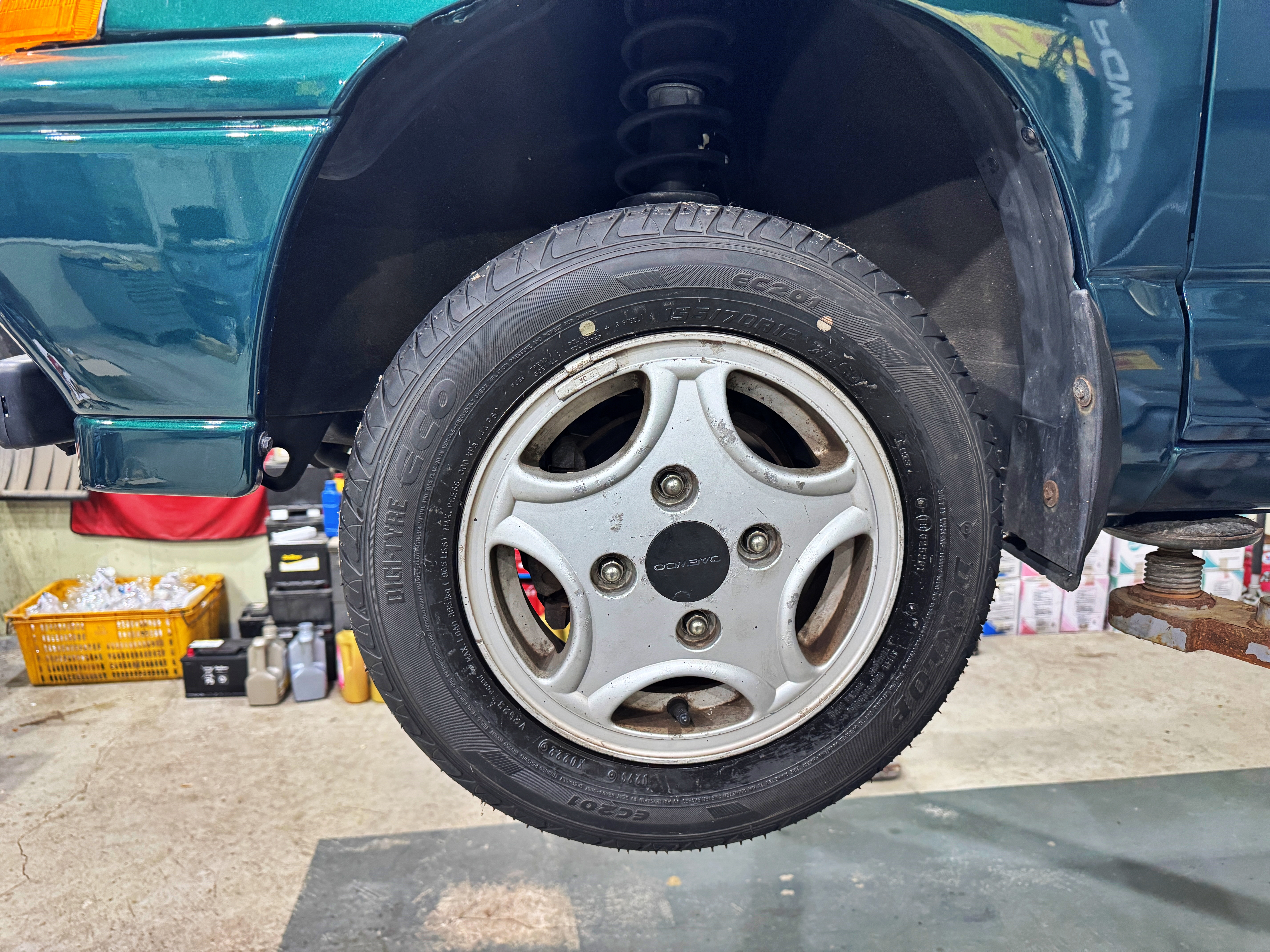 지금은 구하기 어려운 티코의 순정 12인치 알루미늄휠에 던롭 타이어가 끼워집니다.