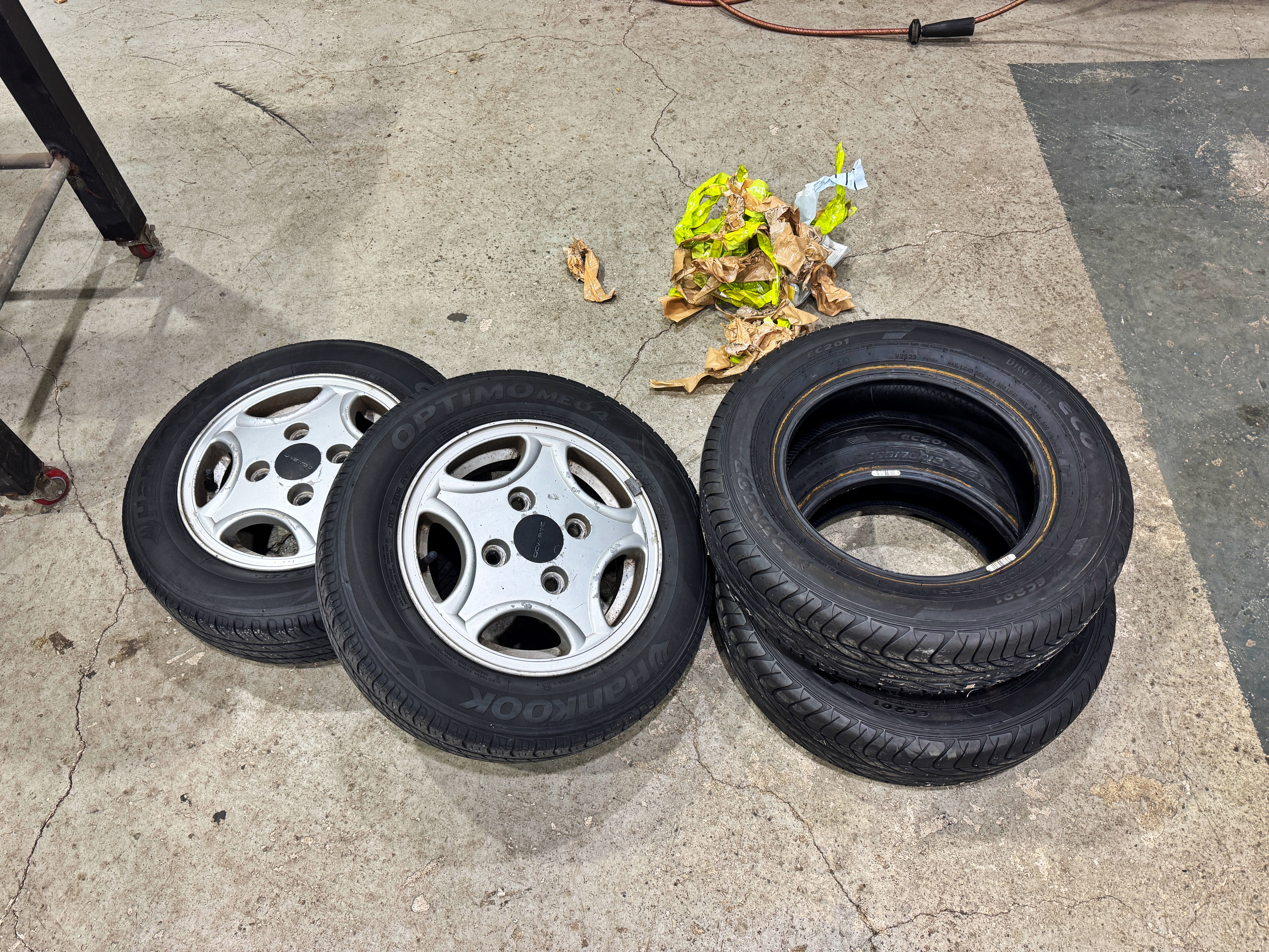 이 상황을 타개하고자 10월 말쯤 차를 움직일 계획을 세웠었으나, 결국 바쁘고 피곤한 관계로 밀리고 밀려 11월 중순이 넘어서야 중고 배터리를 끼우고 차를 움직이게 되었습니다. 그 사이에 일본에 가서 타이어를 두 본 구입하여 넘어왔었고, 일본에서 가져온 타이어를 끼웠습니다.