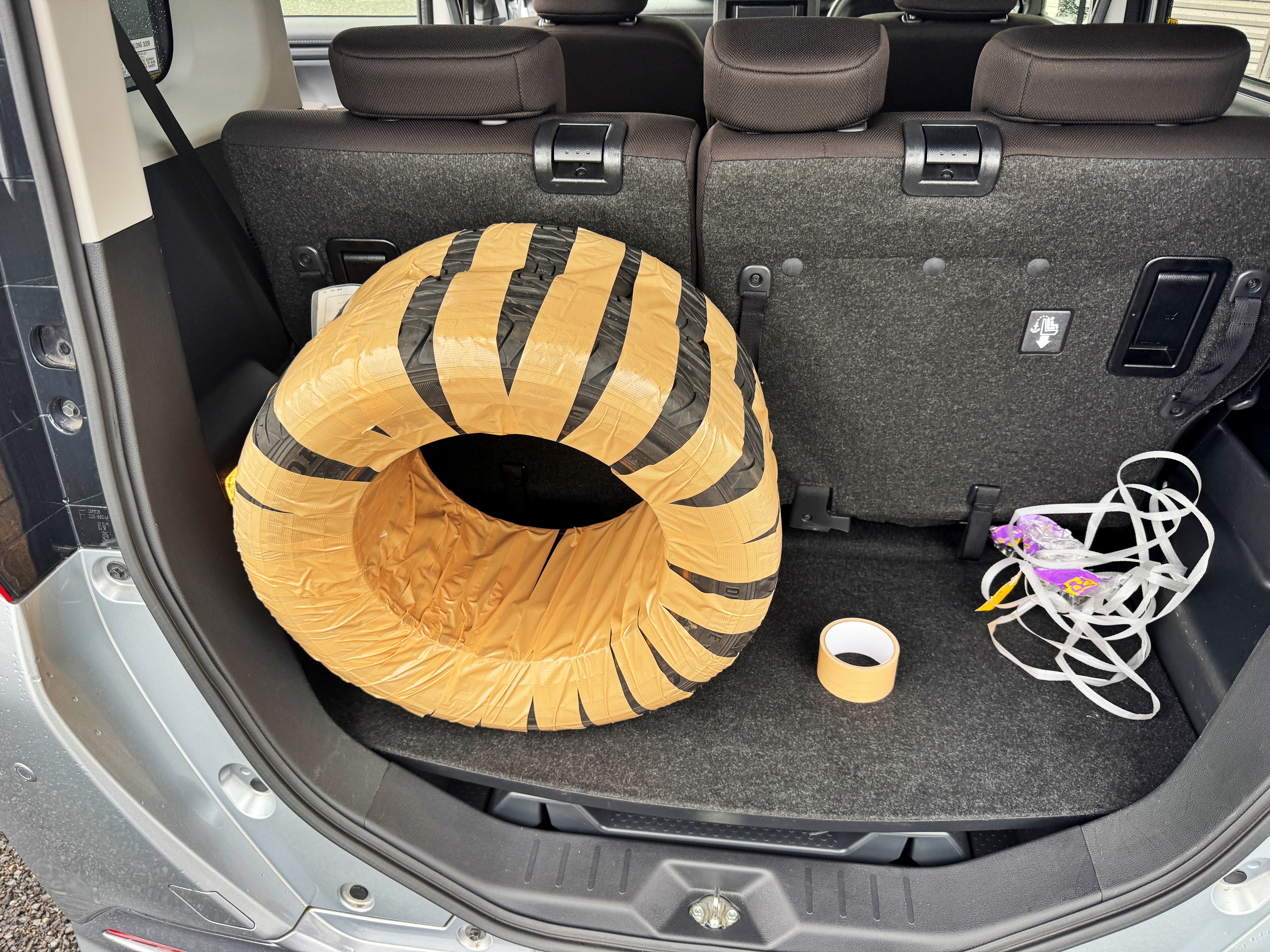 여튼 이 타이어를 렌터카에 넣고 다니다가, 공항에 가기 직전 대충 면테이프를 구입하여 칭칭 감았습니다. 기내수하물로는 어려워도 위탁수하물로는 가지고 탈 수 있기 때문에 큰 문제는 없을 것이라는 판단 아래에서요.