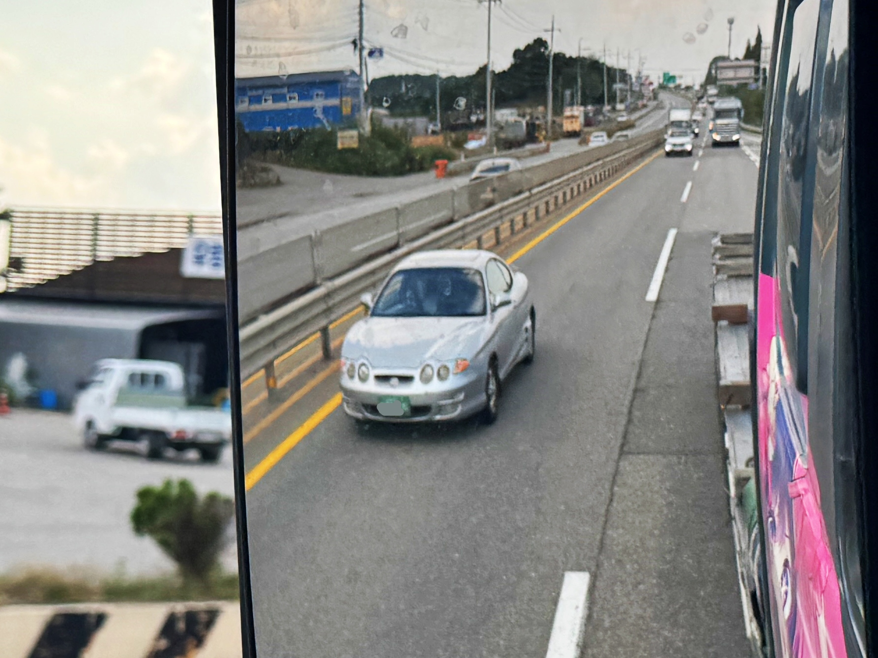 70km/h 구간단속구간이라 속도는 그리 빠르지 않았습니다만, 흐름에 뒤처지지 않고 잘 달리고 있었습니다. 특이점으로 검게 변하긴 했지만 연비스티커와 월드컵 스폰서 스티커가 그대로 살아있는 모습으로 보아 썬팅도 한 번 하지 않고 타고 계신 것으로 보이더군요.