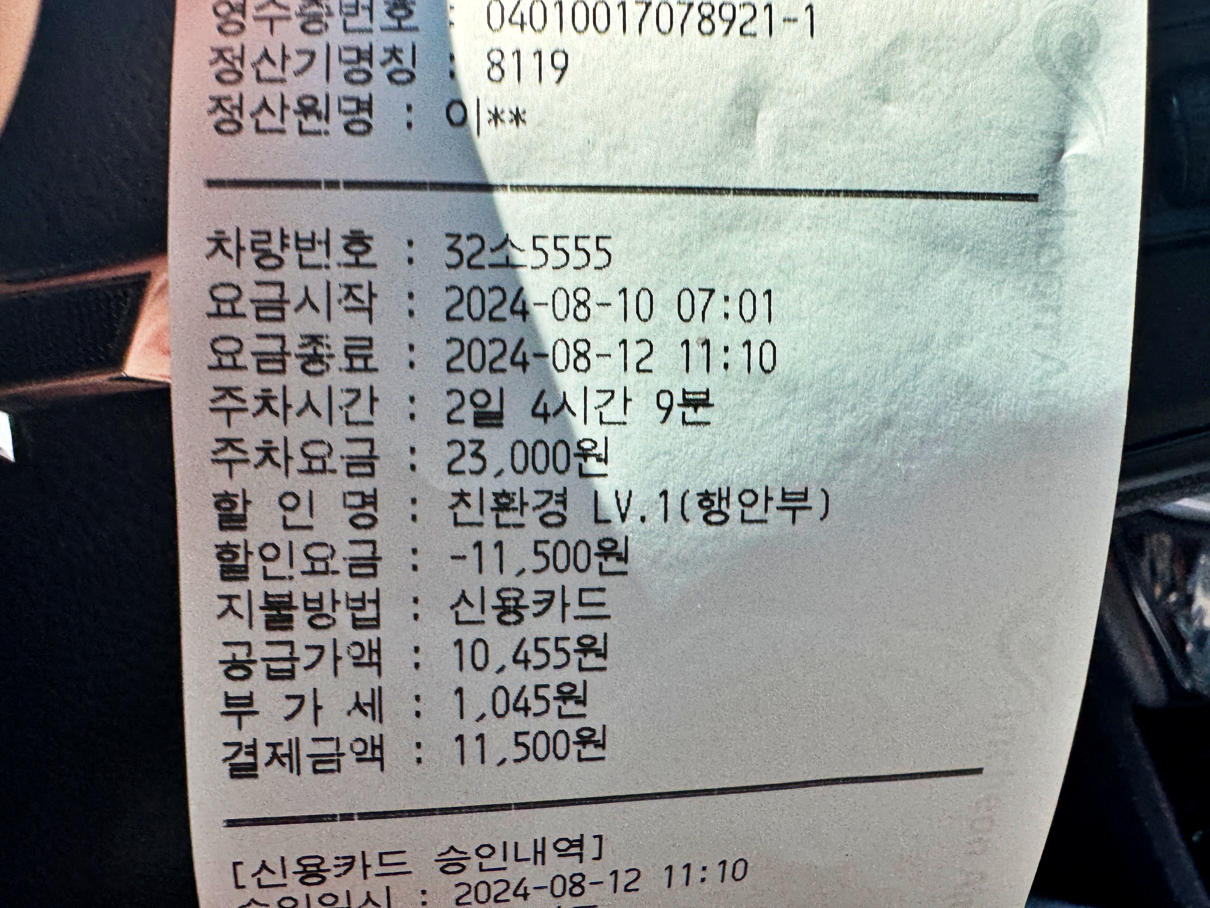 전기차라 주차비는 반값. 발레파킹은 카드 혜택으로 무료.
