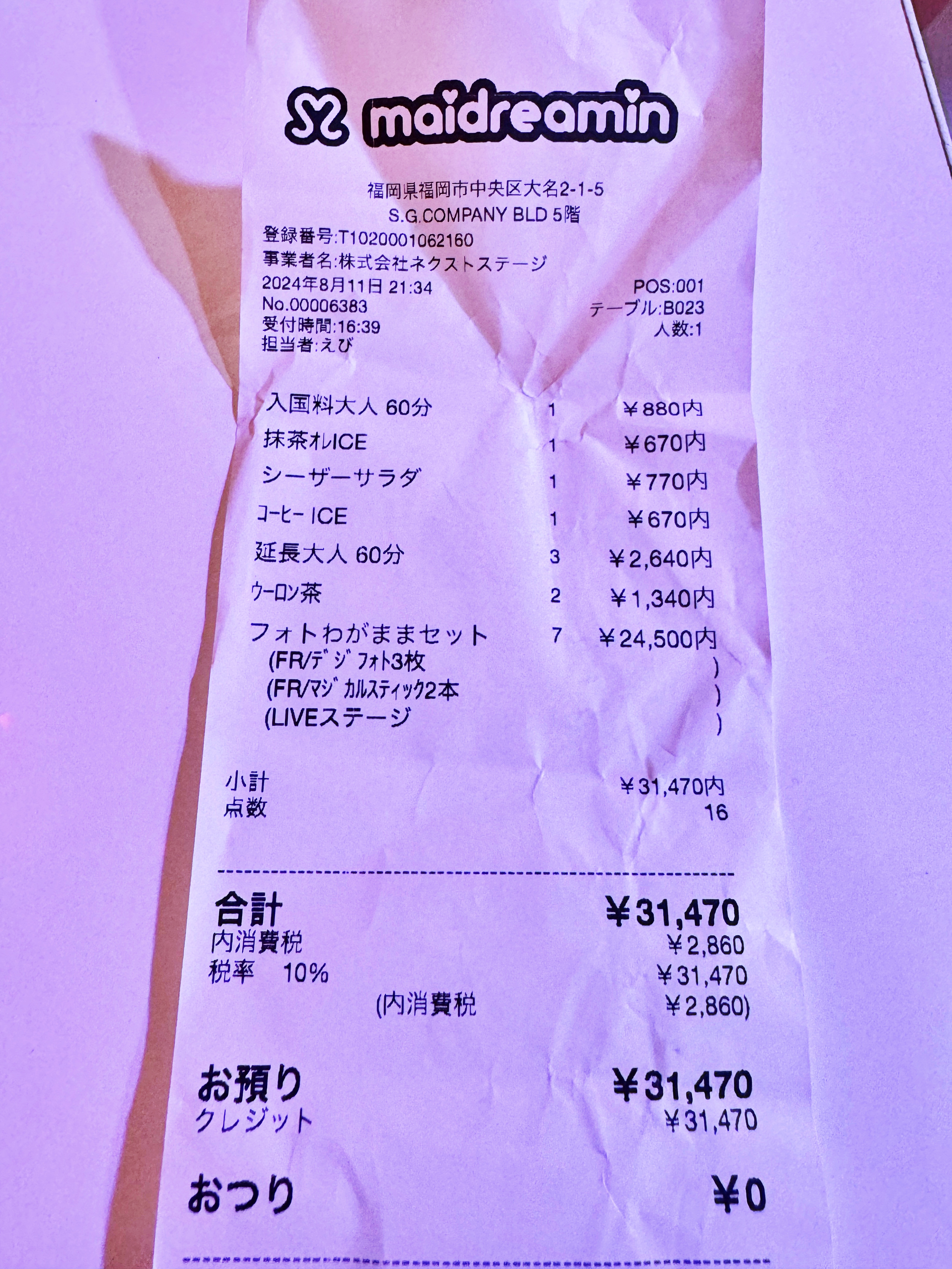 라이브와 체키 그리고 야광봉이 세트로 묶인 와가마마세트만 7개가 청구비용의 대부분입니다. 연장 포함 입국료 추가 4회. 우롱차 두 잔. 아이스커피 말차 한 잔. 저녁으로 샐러드 한 개. 그렇게 해서 오래 있던 것치곤 그리 많은 돈을 쓰지 않았네요.