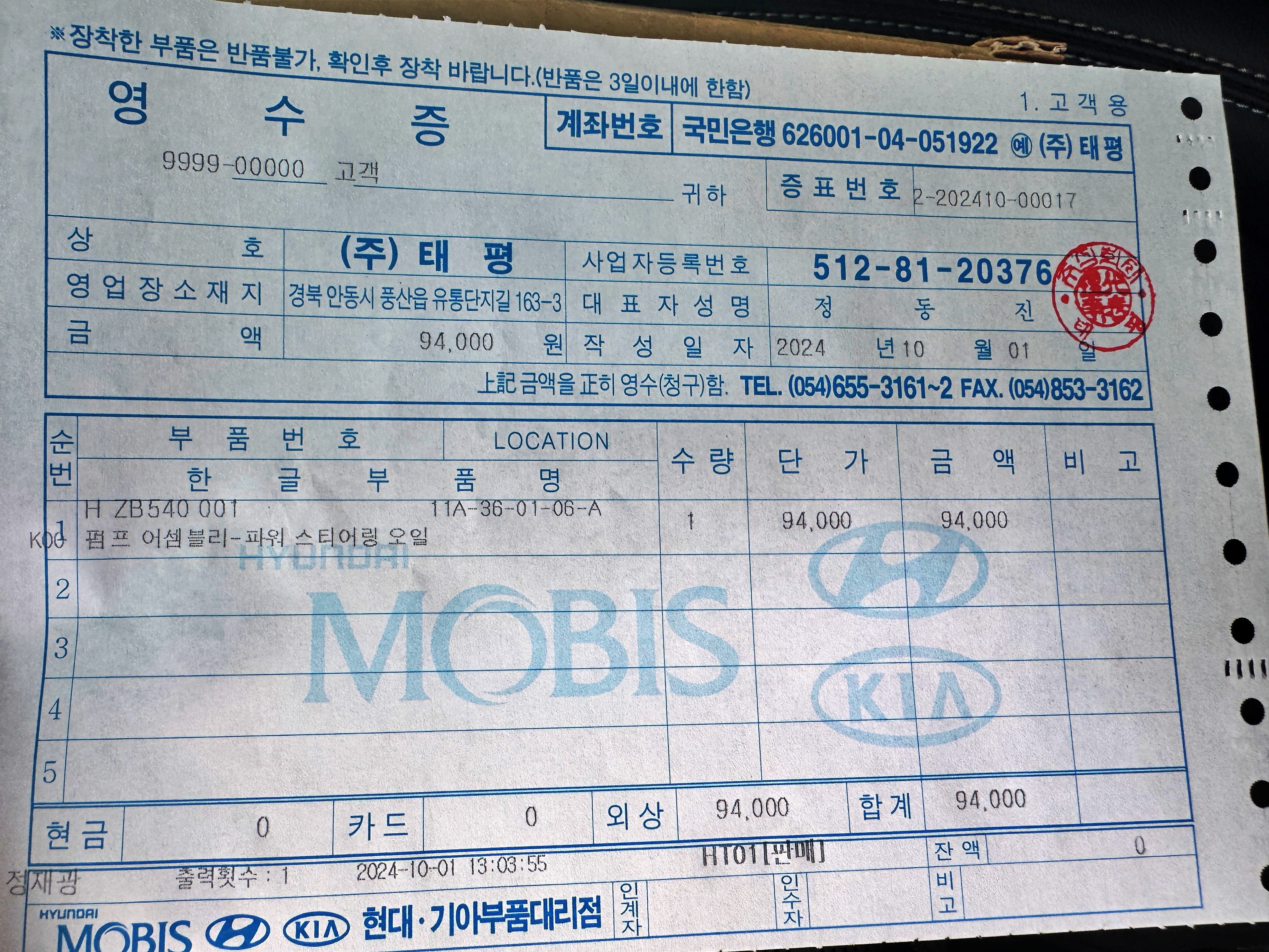 모비스에 나오는 가격은 93,940원이지만 94,000원을 결제했습니다. 그 외에 다른 부품들의 품번도 불러줬었으나 다른 물건들은 재고가 없다고 하네요. 그래서 티코 부품도 물어보려다가 그냥 나왔습니다. 주변에 살고 계신 지인분을 만나 밥을 먹고, 안동 시내에 있는 다른 부품점에서 친구가 구해달라는 부품을 구해서 돌아왔습니다. 식사 얘기는 다른 포스팅에서 따로 다루도록 할게요.