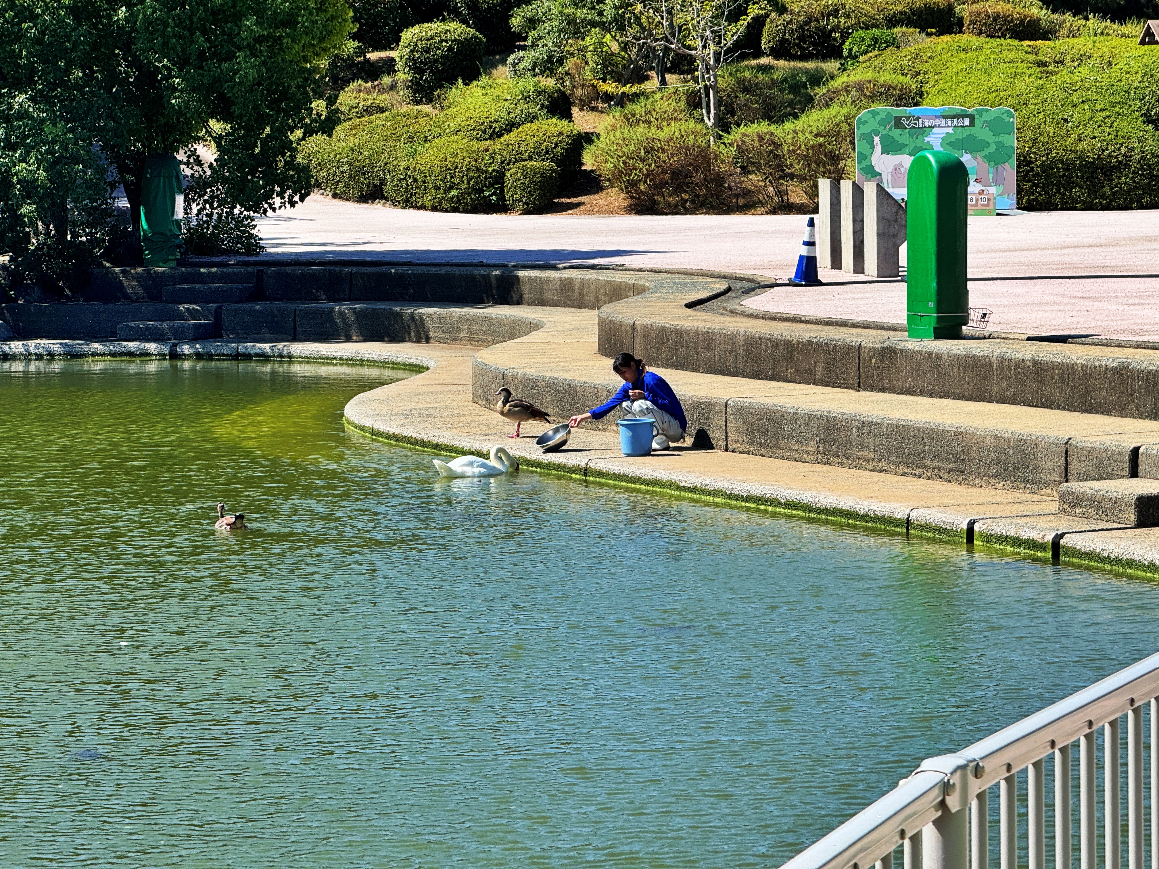 공원 내 동물원에서 근무하는 사육사가 오리와 백조에게 밥을 주고 있었습니다.