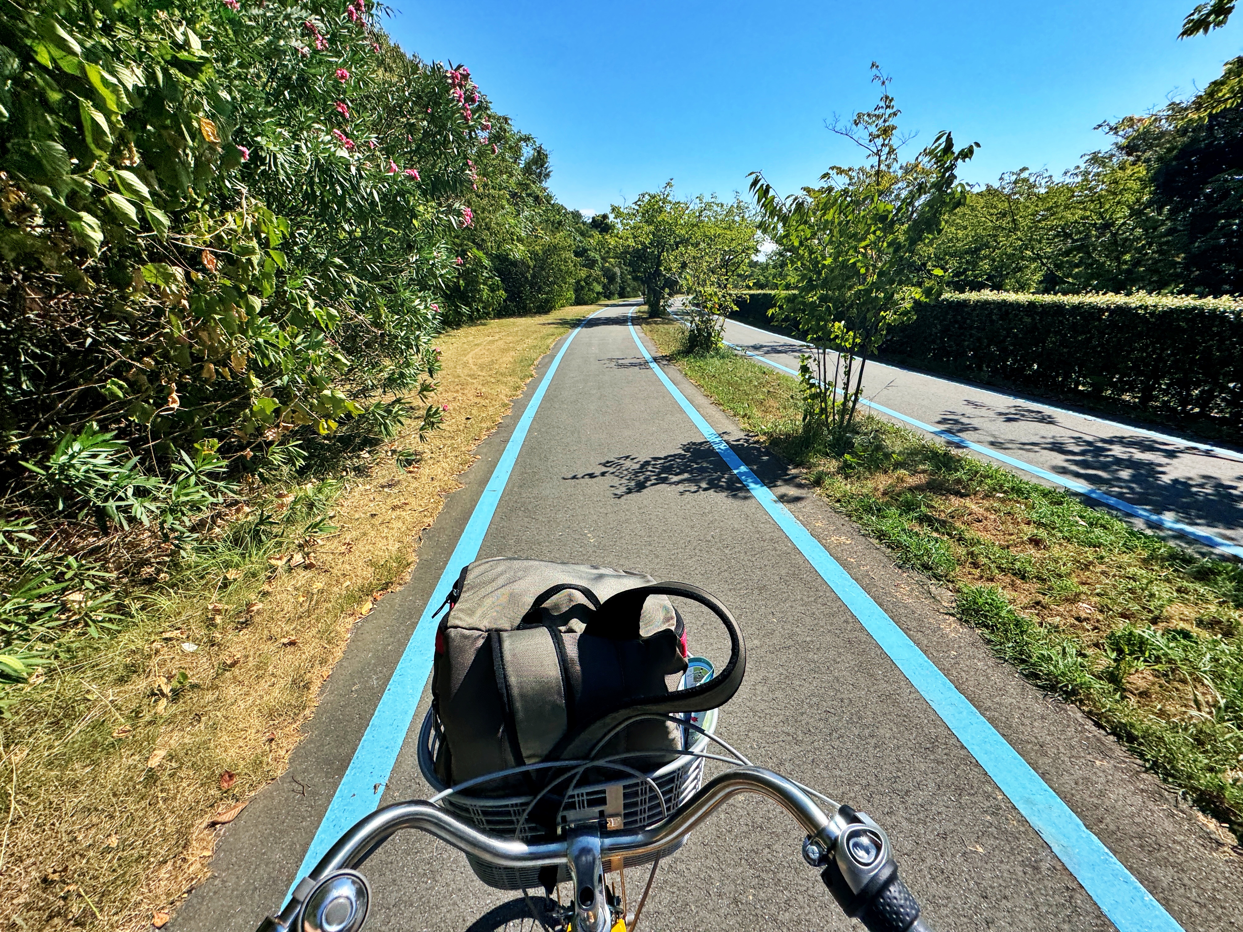 날씨는 덥지만 평화롭게 자전거 도로를 달리고 있습니다.