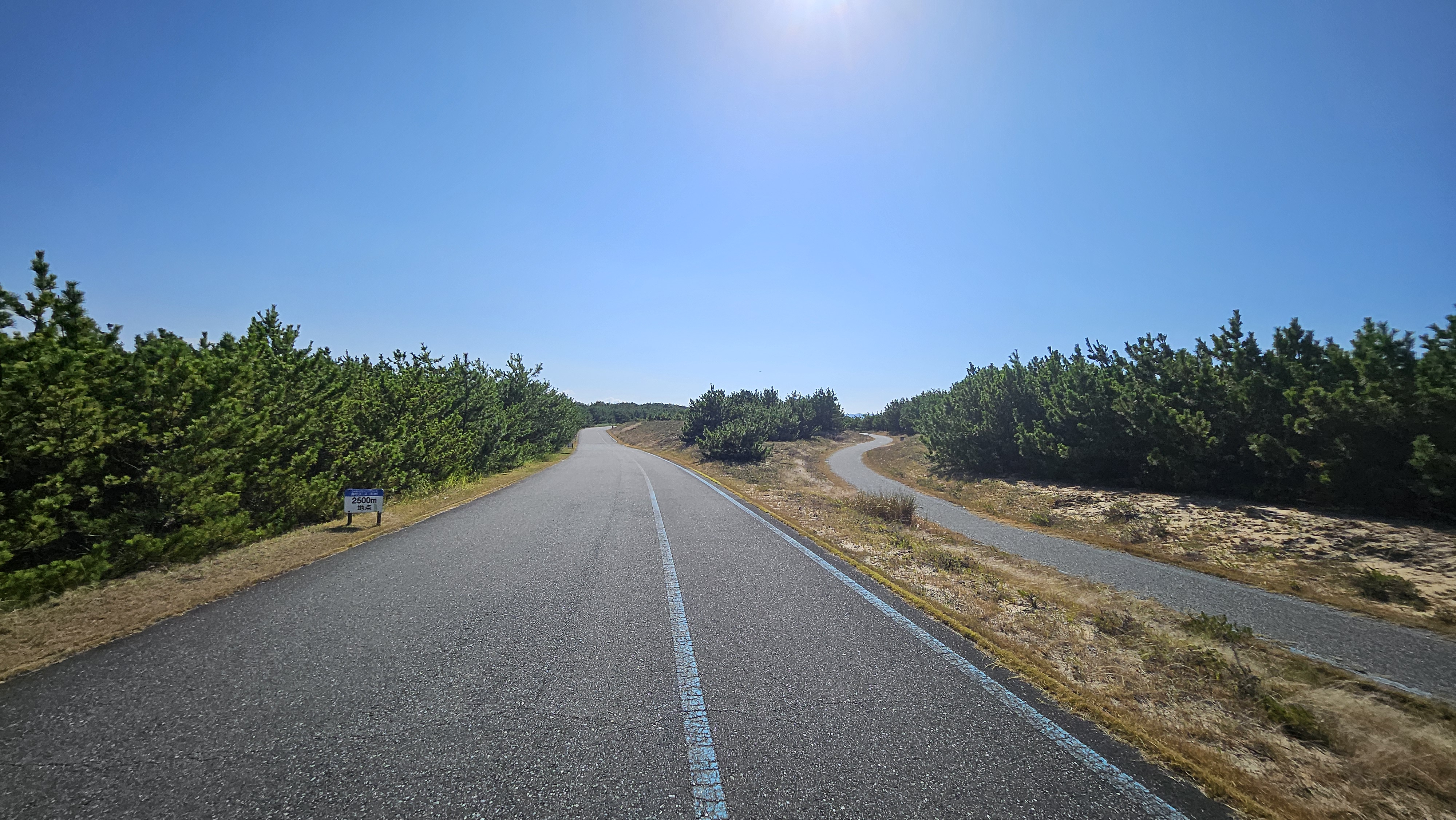 작은 소나무가 심어진 자전거 도로를 달리고 또 달립니다.