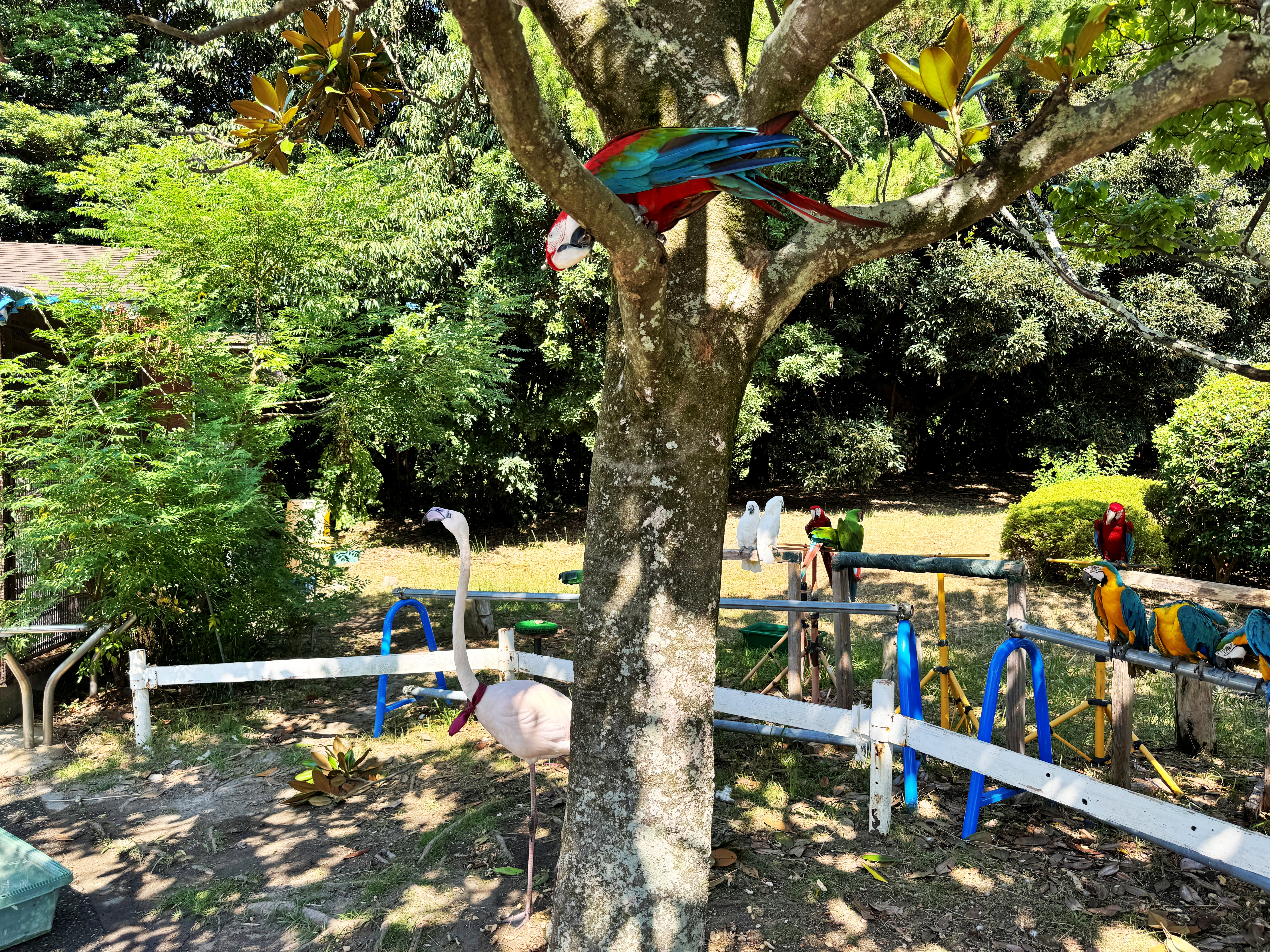 홍학도 보이고요 앵무새도 보입니다. 이 더운 날씨에도 동물원을 돌아다니는 몇 없는 사람들이 앵무새와 사진을 찍고 앵무새에게 말을 걸고 있습니다만, 저기 한 앵무새의 행동이 이상하더군요.