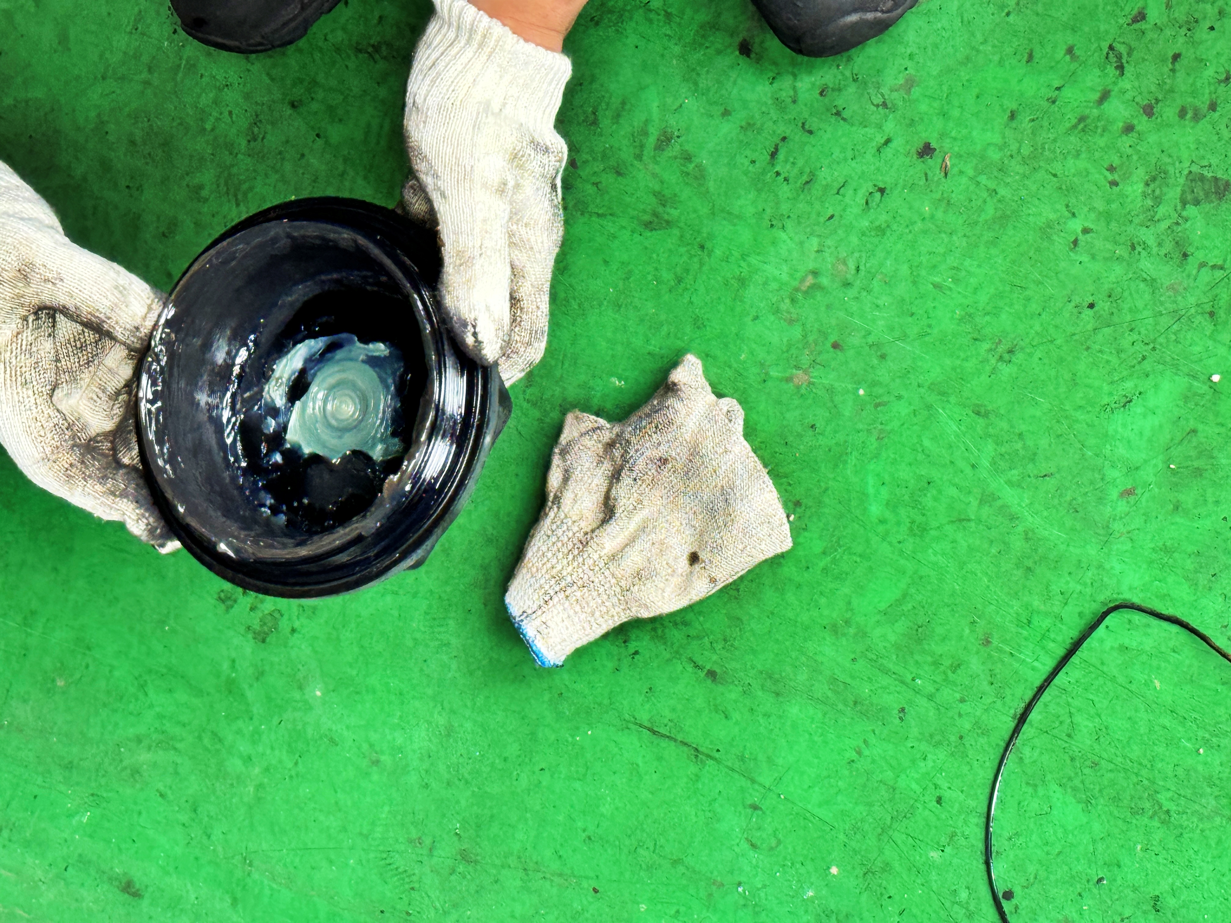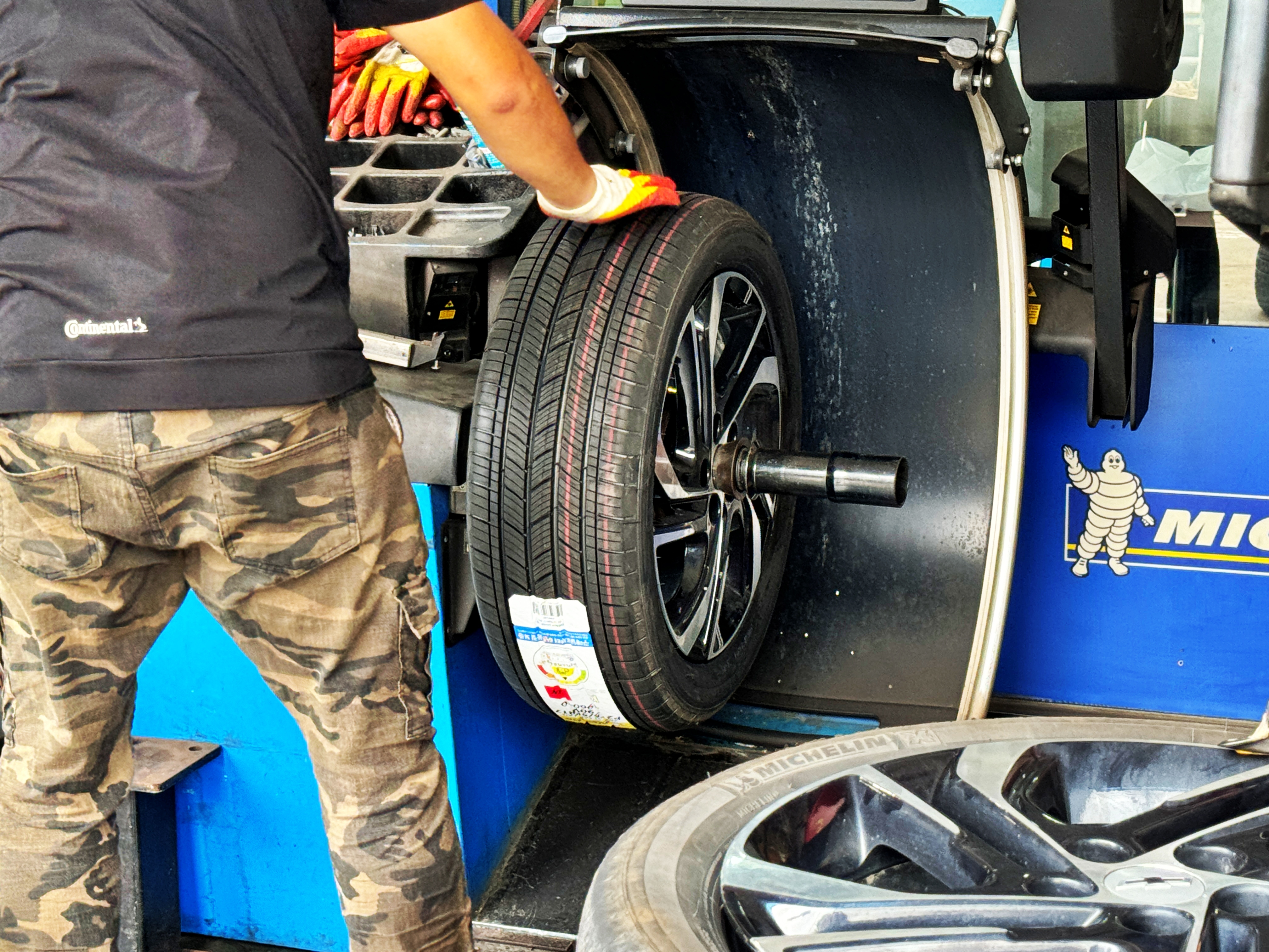 기존 타이어의 탈착과 새 타이어의 부착 그리고 휠 밸런스 작업이 빠르게 진행되고 있습니다.