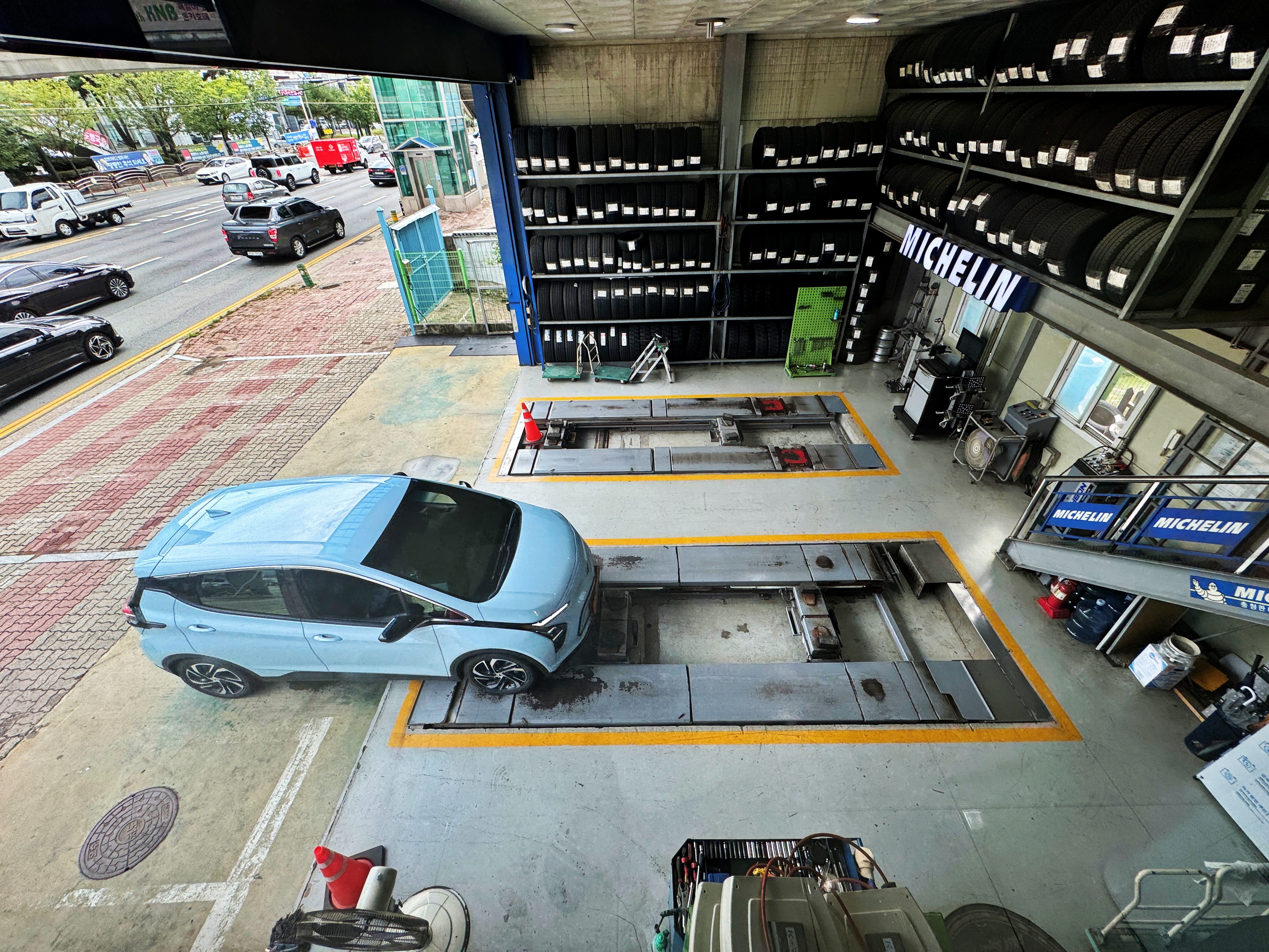 가게에서 알려주는 방법대로 미쉐린 앱에 가입하고 교체하는 타이어의 정품 등록까지 마쳤습니다. 그리고 고객대기실에서 작업이 진행되는 모습을 구경합니다.