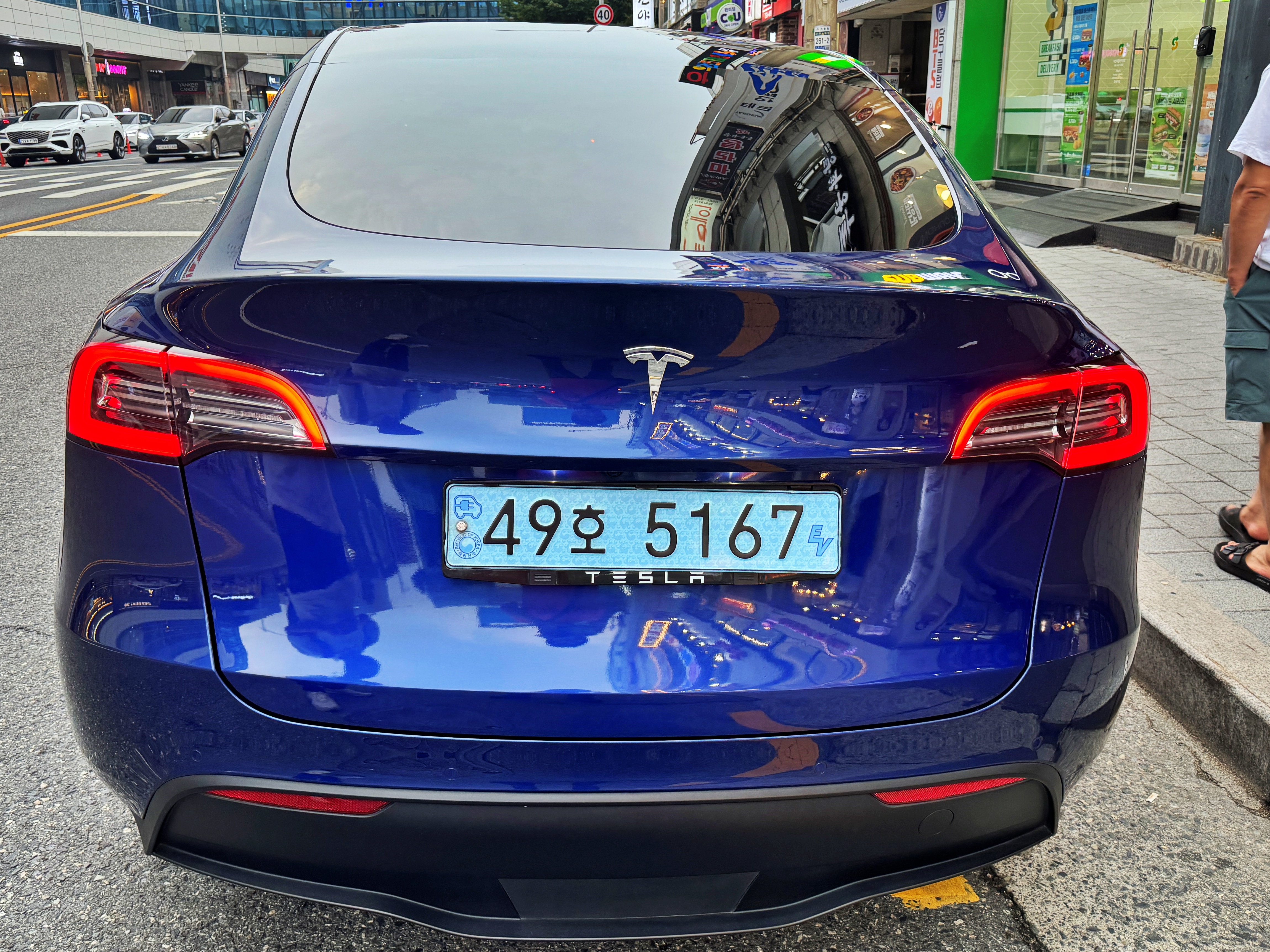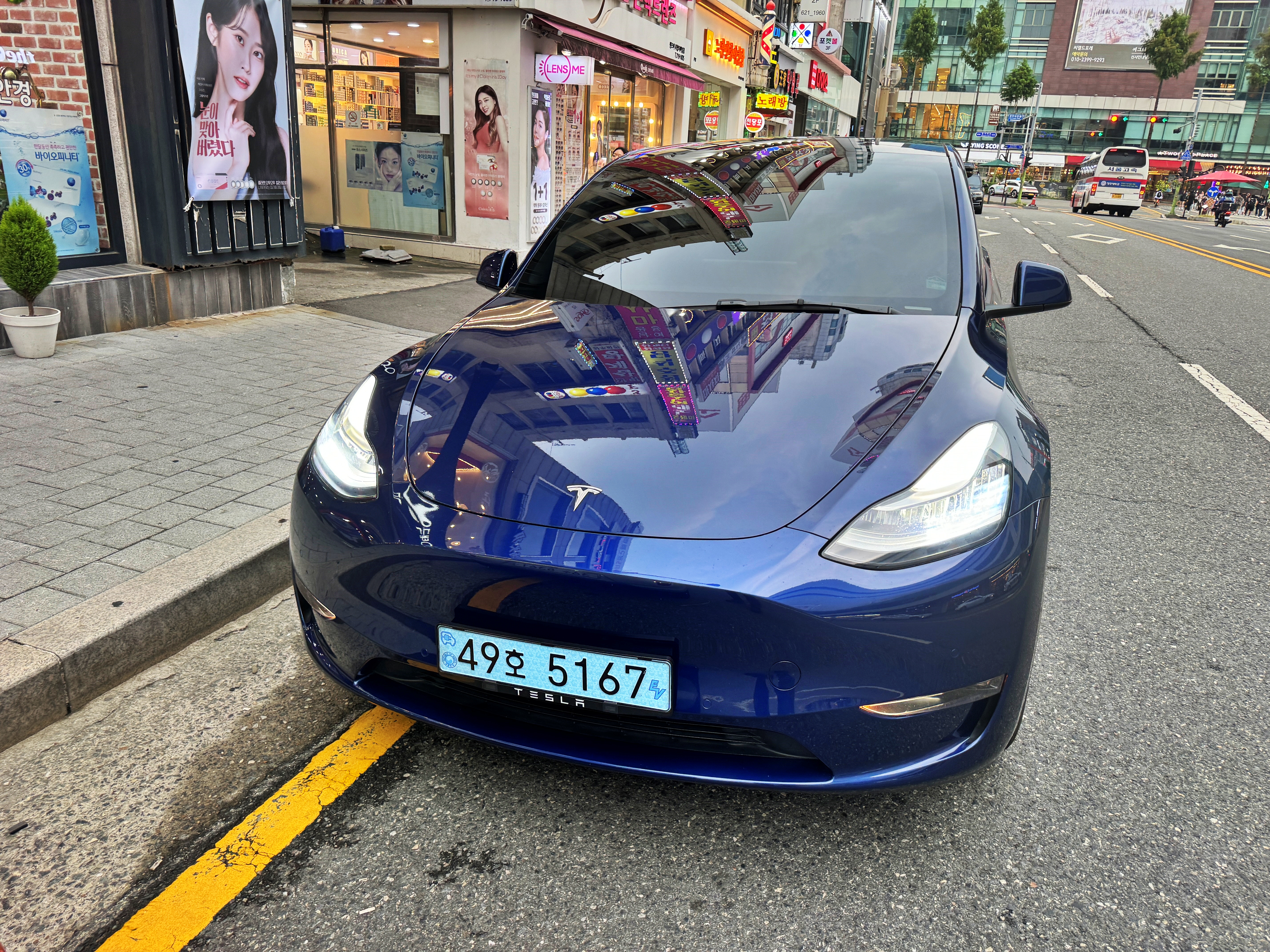 차량 외관을 확인합니다. 흰색이 올 줄 알았는데 파란색 차가 왔더군요. 모델 3와 거의 대부분의 부품을 공유하는 CUV 버전의 차량임에도 상당히 크게 느껴집니다. 중형으로 취급되는 차량인데도요. 왜 그런지 봤더니만 전폭이 1,925mm네요. G80의 전폭이 1,920mm, G90의 전폭이 1,930mm입니다. 어지간한 대형세단 수준입니다.