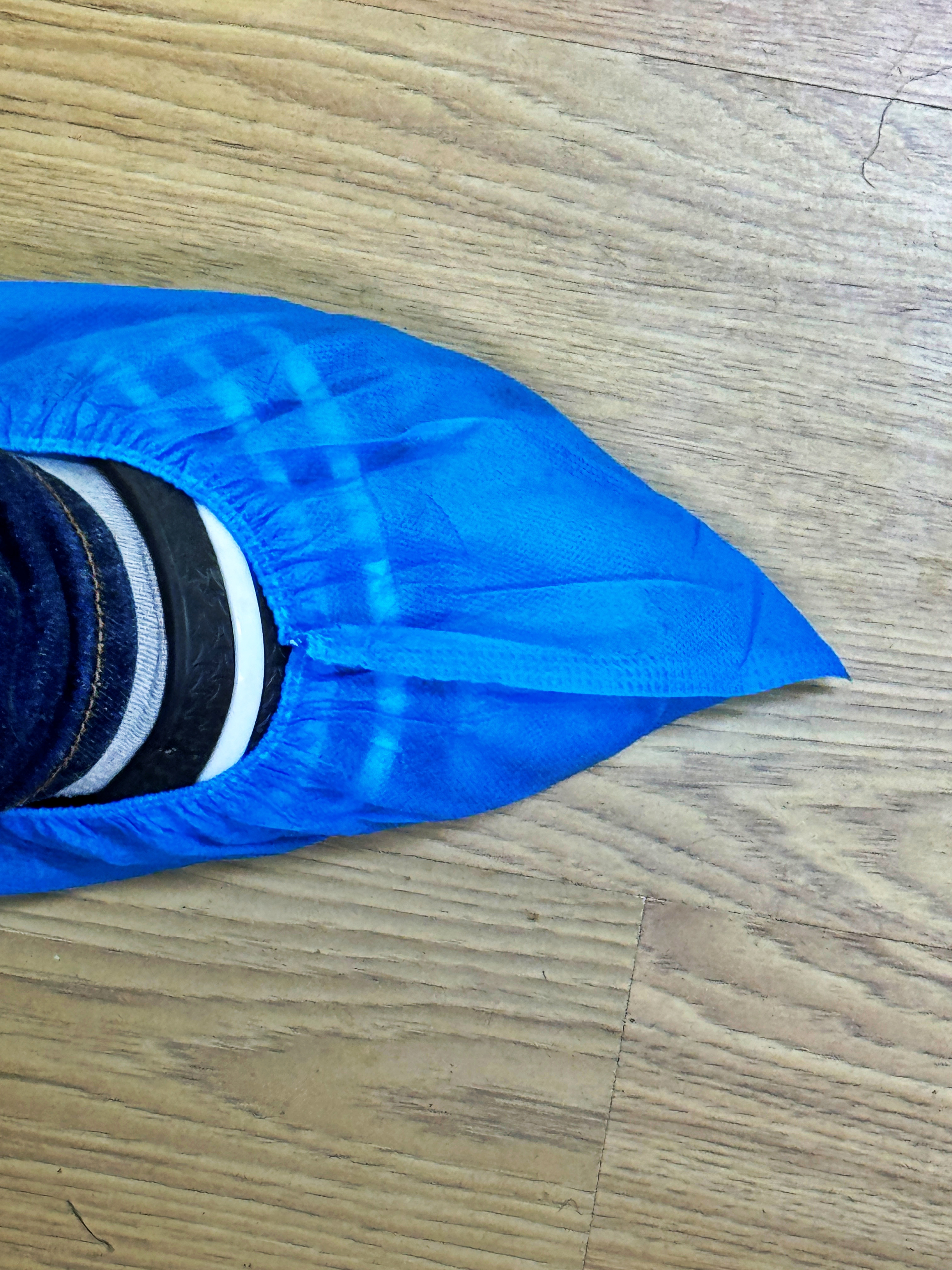 부직포 재질의 일회용 신발커버를 씌우고 학교 건물로 들어갑니다.