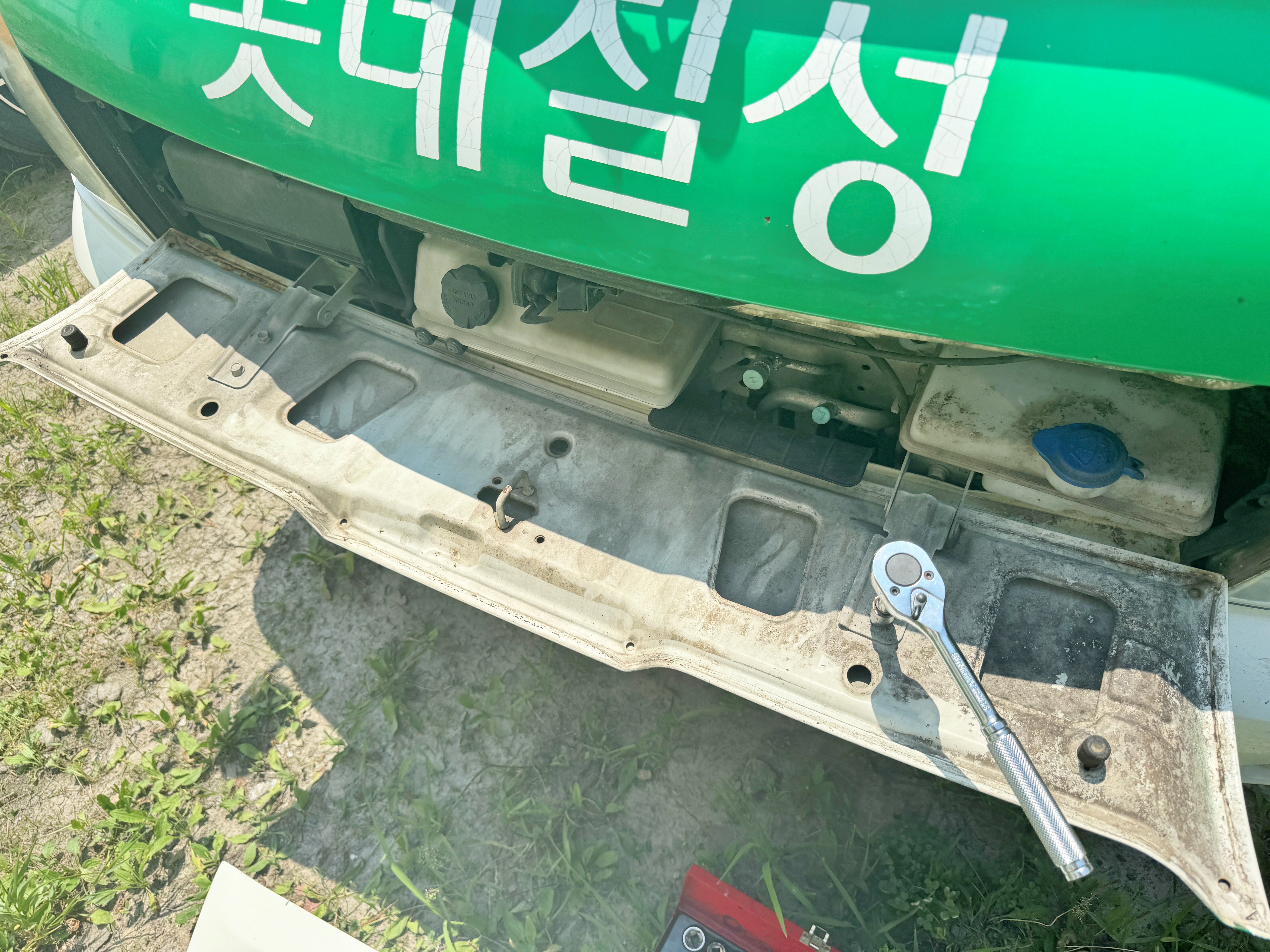 무교환으로 16년을 버텨왔던 본넷의 볼트를 풀어줍니다. 약간 유격이 생겨 운전석 헤드램프에 간섭이 있었던지라 새 본넷으로 교체하면 조금 더 나아지겠지라는 생각으로 무교환차를 교환차로 만들어 버립니다.