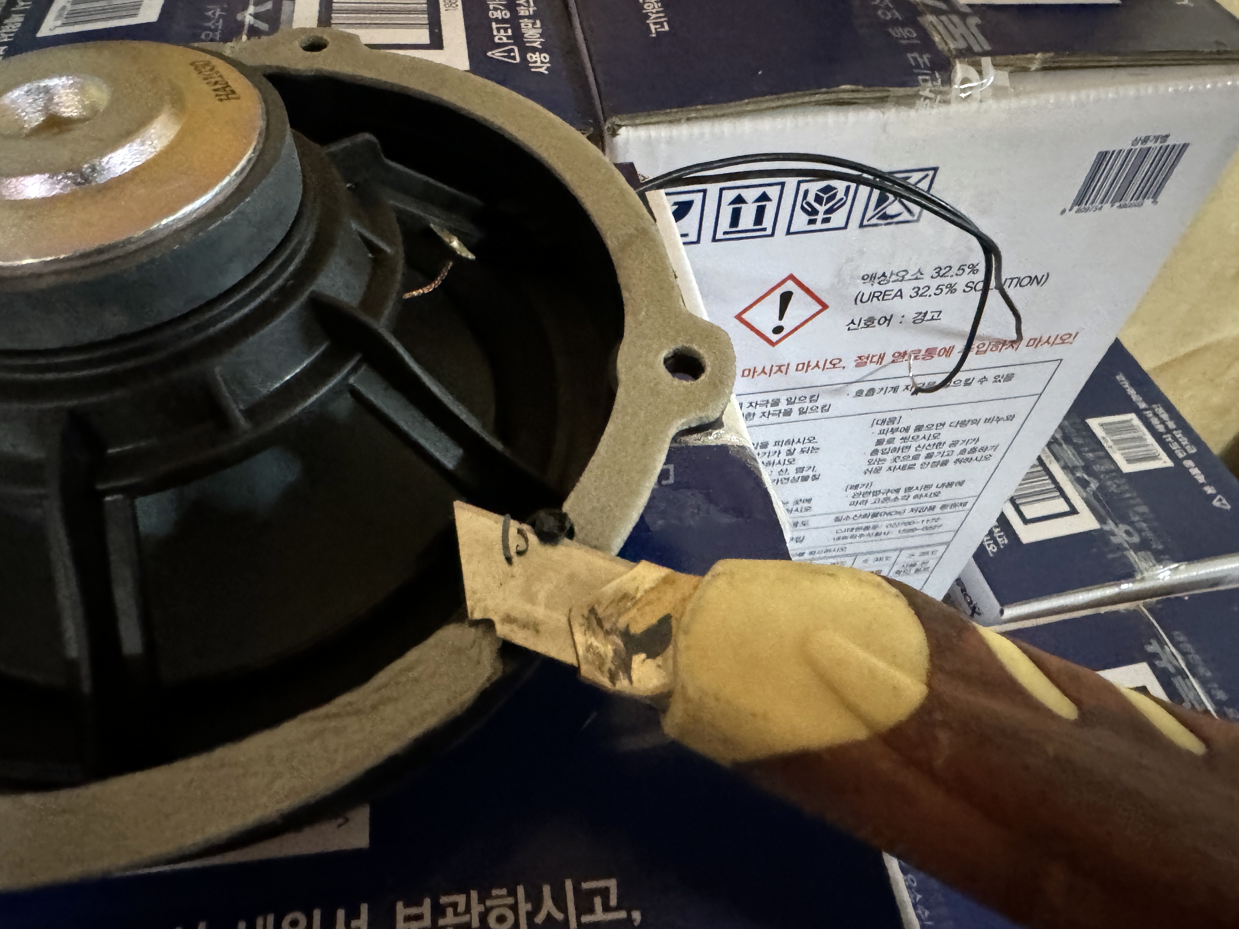 그래서 예전에 삼각떼를 타면서 탈거해뒀던 아반떼용 6인치 프론트 스피커를 포터에 이식하기로 합니다. 비스토 스파크까지 타며 사용했던 스피커를 지난 2019년 8월에 아반떼에 알갈이로 끼워두며 보관해 뒀었는데 5년 가까운 세월을 박스 속에서 보낸 뒤 드디어 빛을 보게 되는군요.