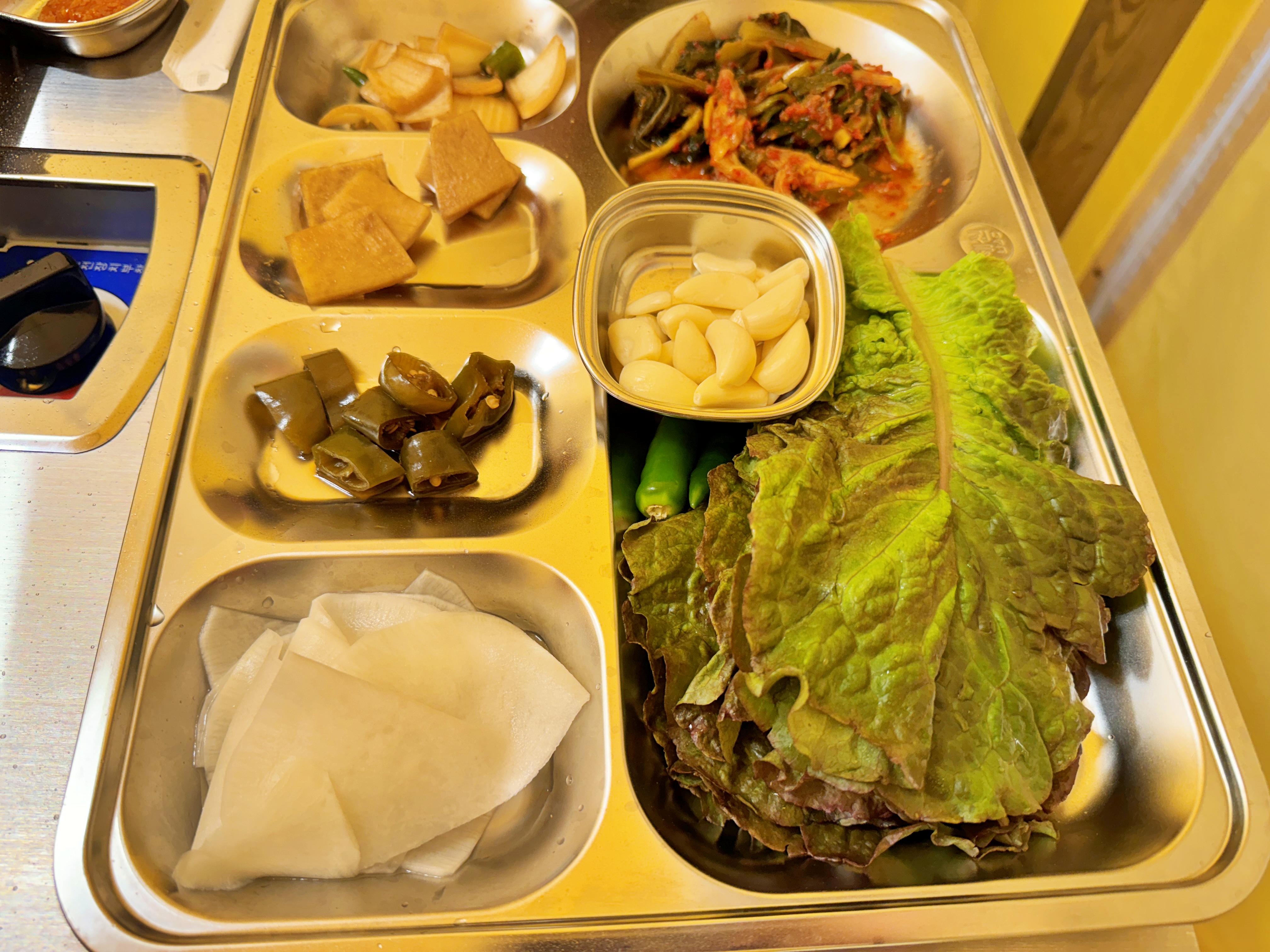식판에는 각종 장아찌와 쌈무 마늘이 담겨있습니다.