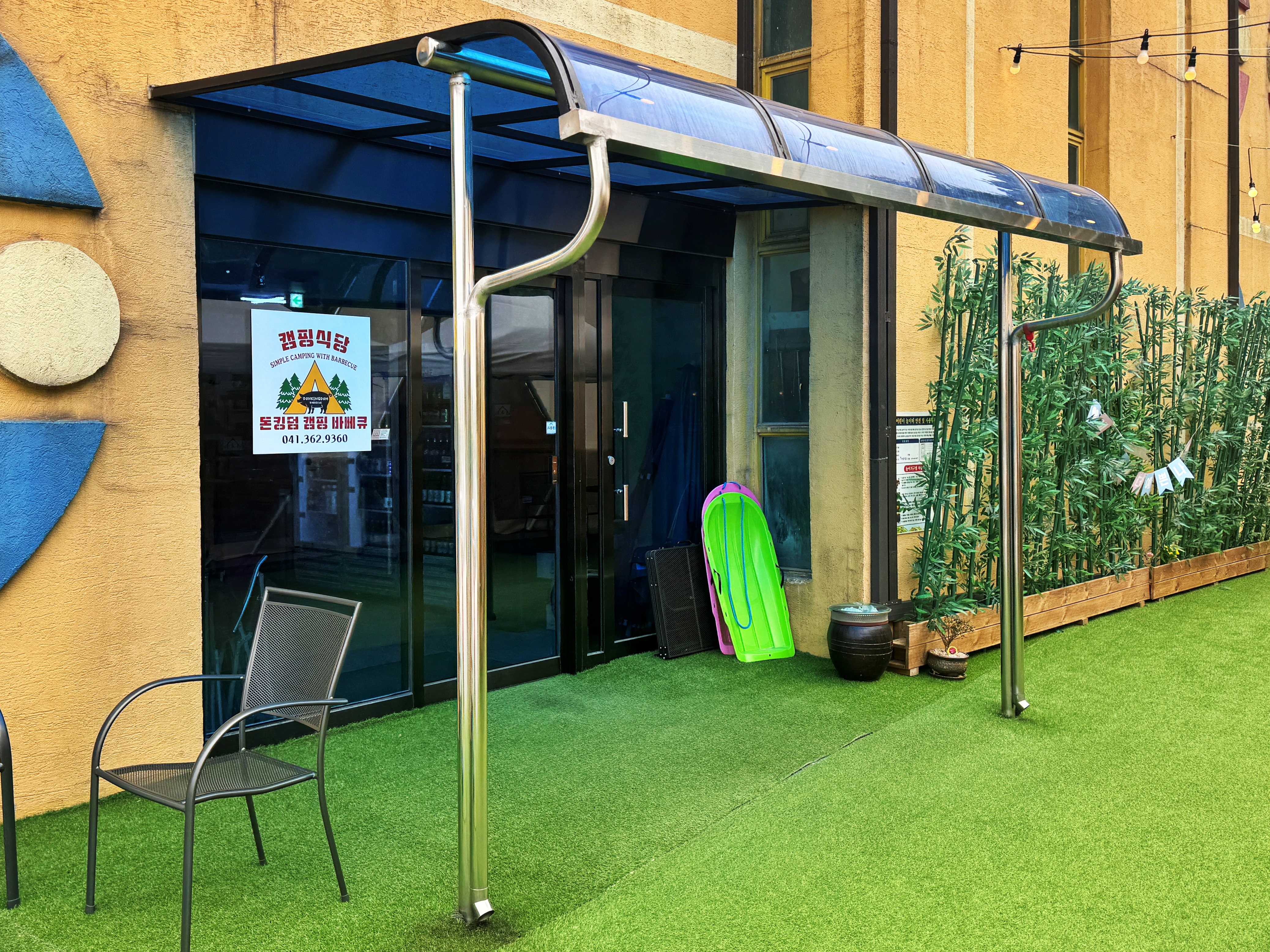 인조잔디가 깔린 건물 측후면으로 글램핑 텐트가 설치되어 있었습니다.