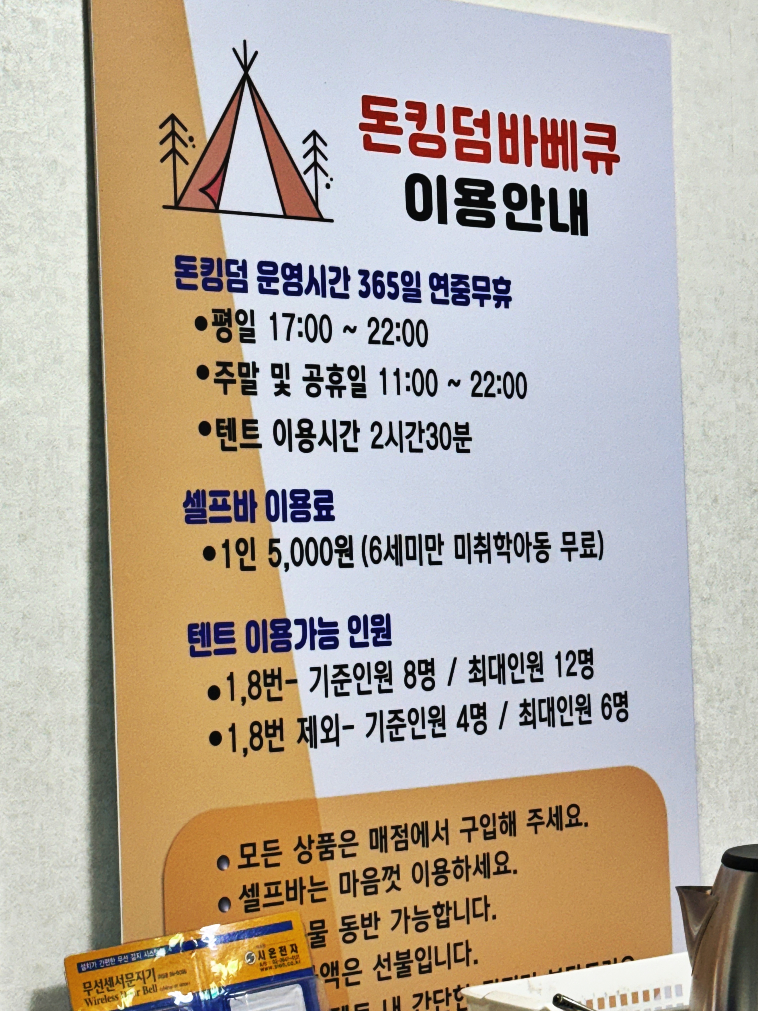 물론 이 텐트 안에서 고기를 구워도 캠핑장에 온 기분은 충분히 낼 수 있습니다만, 5000원을 주고 숯을 구매하면 숯불에 구울 수 있도록 화로대도 빌려준다고 합니다. 그래서 처음엔 숯불에 고기를 구워 텐트 내부 불판에서 한번 더 구워서 먹었고 이후에는 계속 불판에서 고기를 구웠습니다.