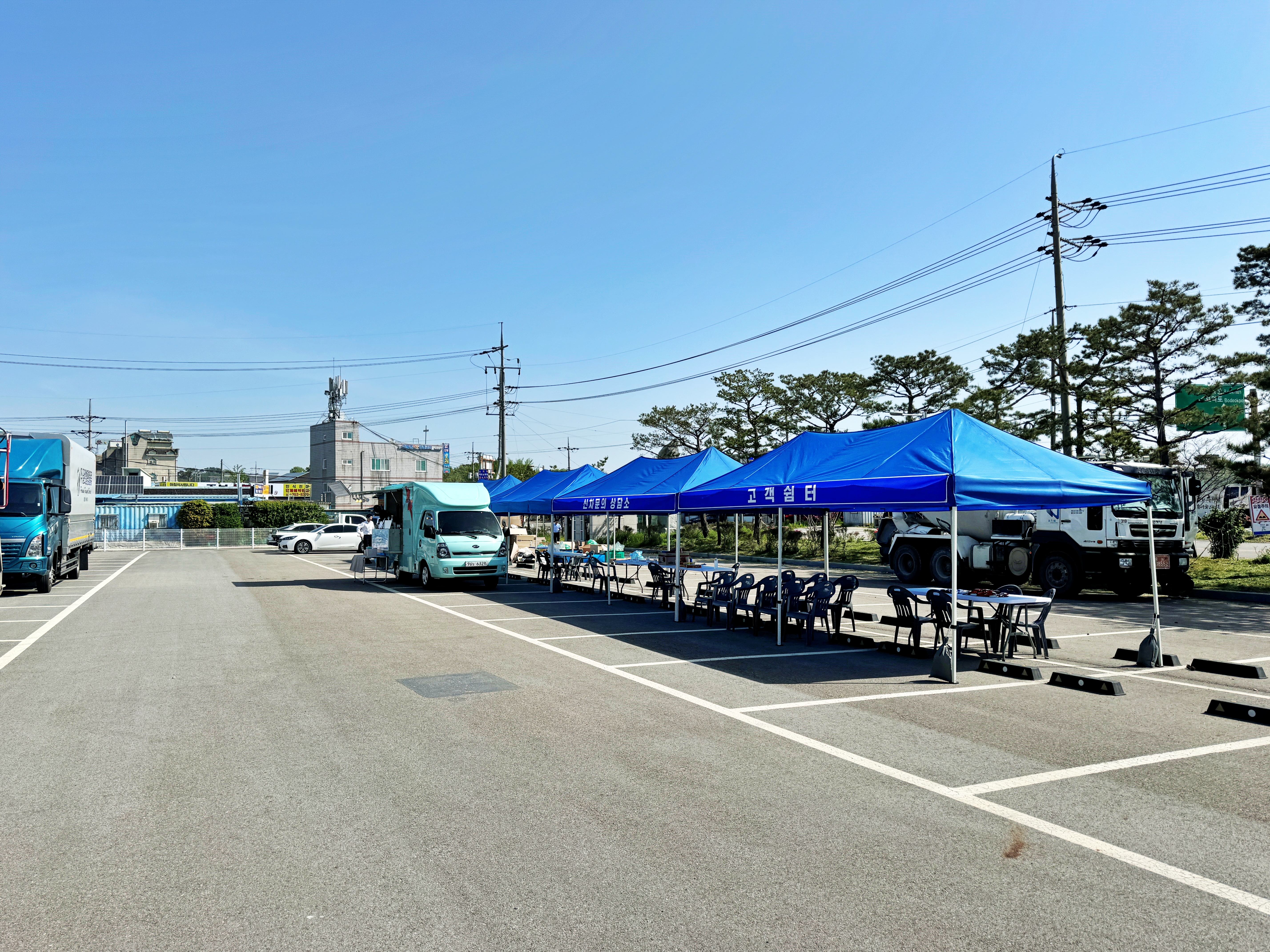 접수처는 커피차 뒤에 있고 신차출고 상담소와 고객쉼터도 보이네요.