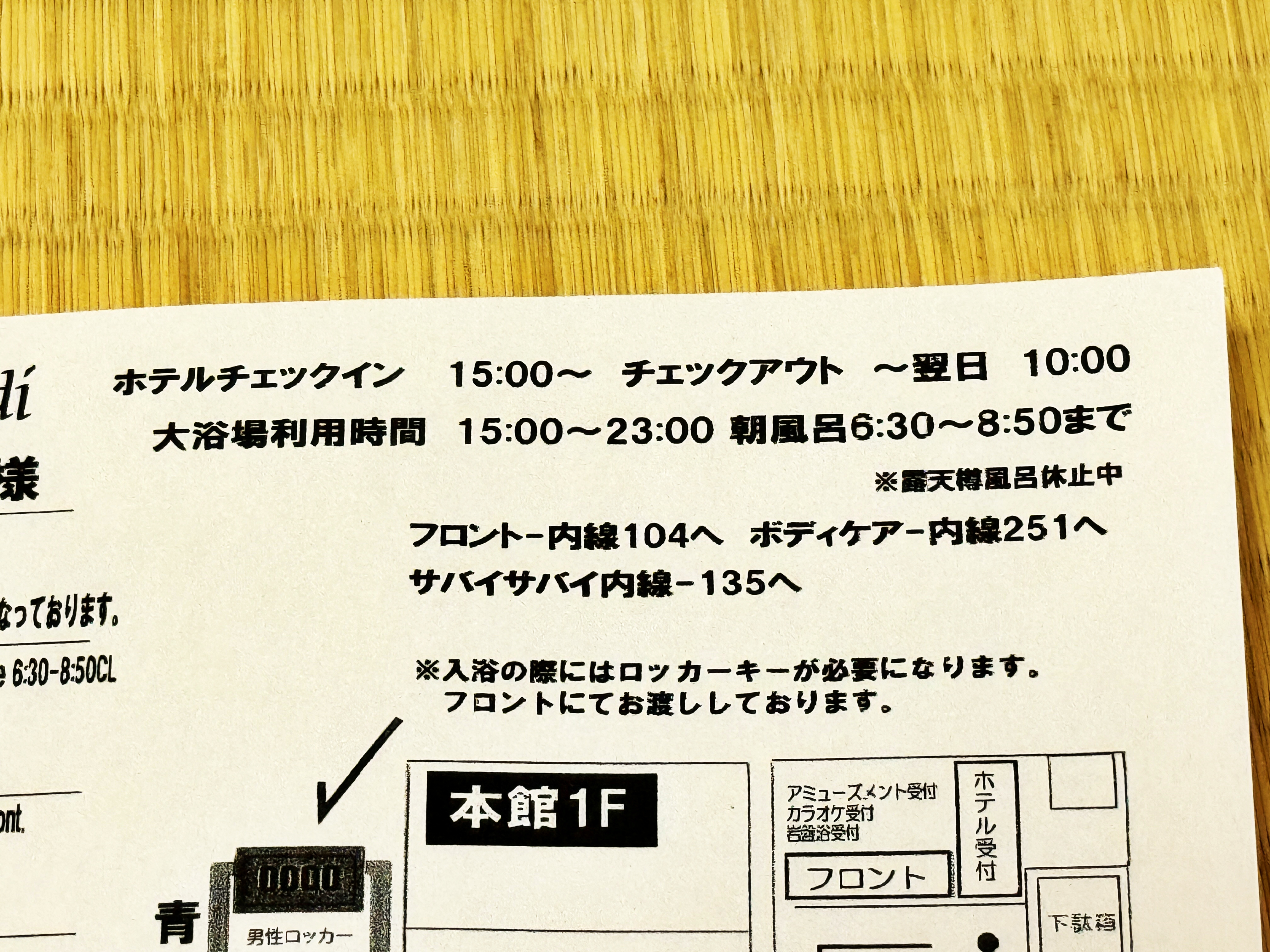 그냥 구겨 넣다시피 넣어야 들어갑니다. 낡은 캐비네에 붙어있는 안내문도 한국과 비슷하네요. 귀중품은 프런트에, 위화감을 주는 이레즈미가 있는 사람들은 입욕을 자제해 달라는 내용입니다.