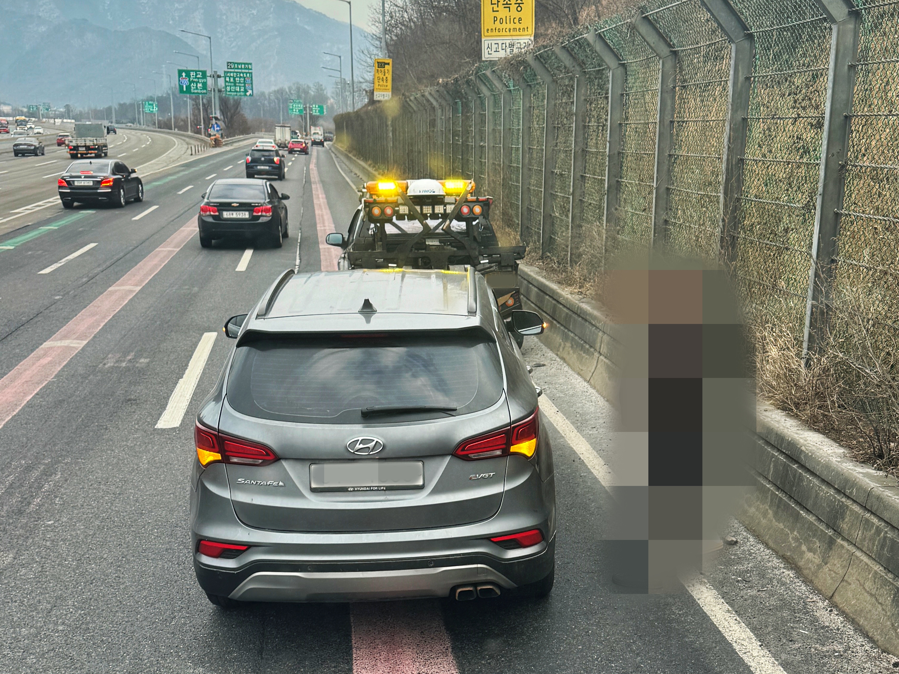 열심히 비집고 들어오셔서도 깜빡이를 끄지 않고 계속 진행하기에 저는 옆에 새로 생긴 차선으로 진입했고 진입하고 좀 가다가 싼타페가 옆도 보지 않고 그냥 2축과 3축 사이 에어탱크가 있는 난간대와 3,4,5축 타이어를 비비고 와서 섰습니다.