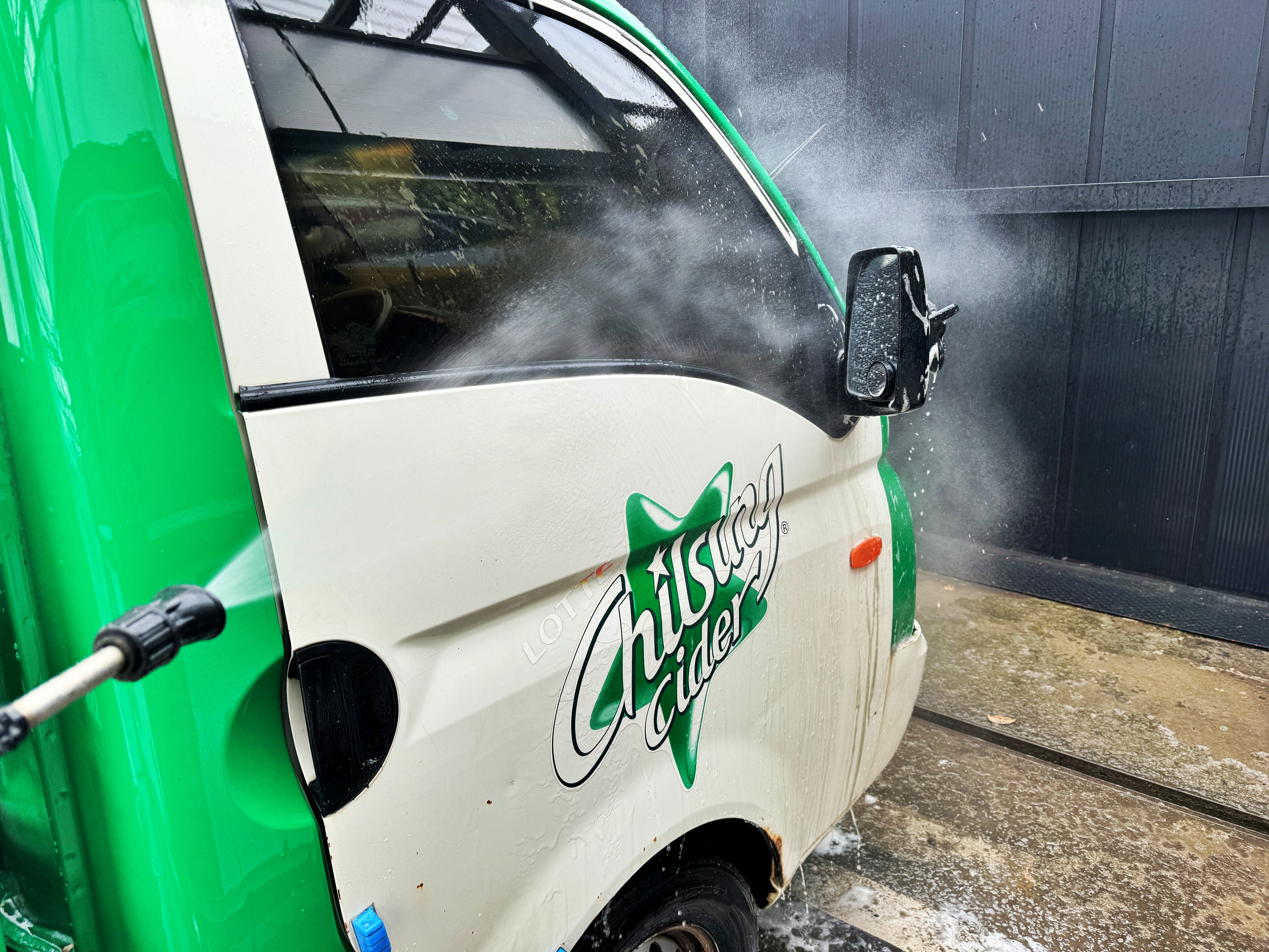 크리스탈코트 플러스보다 더 좋은 왁스입니다. 슬릭감에 특화된 물왁스인데, 이 포터처럼 흰색 위에 녹색 야매도색을 올려 클리어 상태도 썩 좋지 못한 차에 도포해주니 완벽한 비딩은 아니더라도 차체 표면에 물방울이 맺히긴 하더군요. 그렇게 적재함 문짝까지 다 크리스탈 슬릭코트를 도포해줬고, 실내외 세차에 4시간을 투자했습니다.