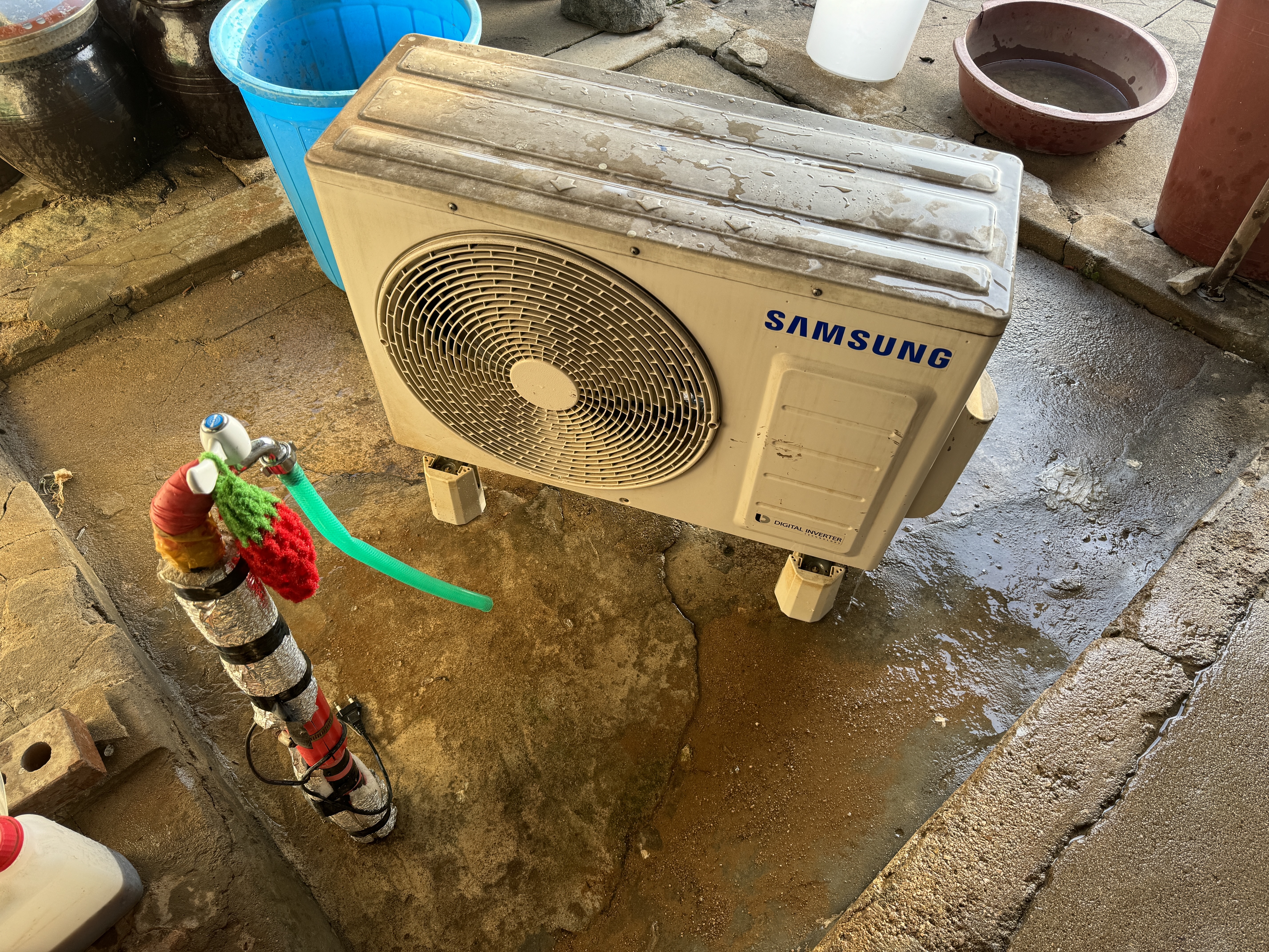 흙탕물이 꽤 나오네요. 실내기는 방 안에 넣어놓고 실외기는 물로 닦아놓은 뒤 한편에 세워놓았습니다. 나중에 시간 될 때 사람을 불러 장착하던지 해야죠. 기존 에어컨이 있던 자리에 그대로 설치하면 될 것입니다.