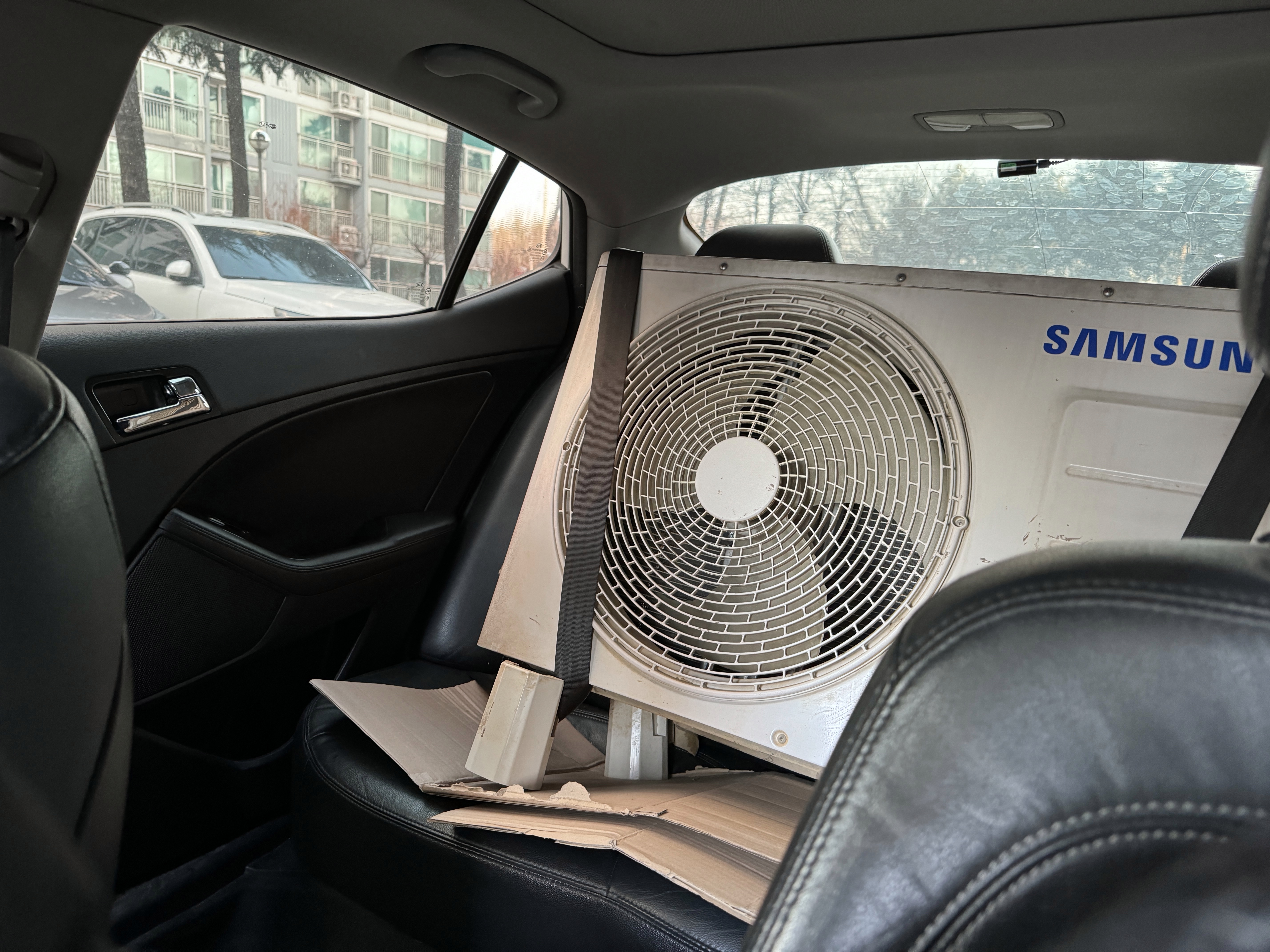 K5 뒷좌석에 박스를 깔고 에어컨 실외기를 올려놓습니다.