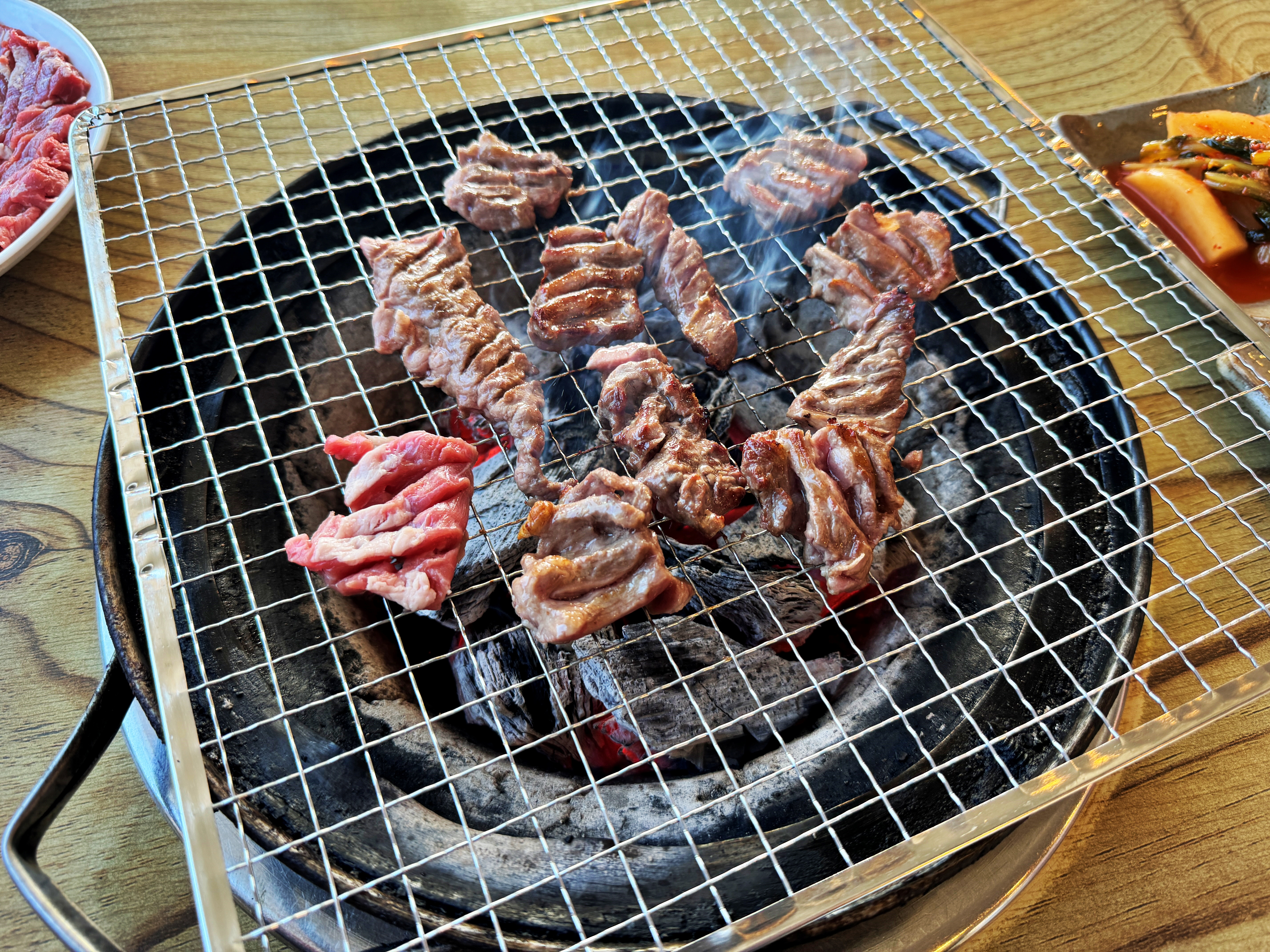 생각보다 빨리 익고 자주 뒤집어주게 되네요. 갈매기살은 갈비살과 삼겹살 사이에 끼어있는 부위인데 삼겹살보다는 갈비살에 가까운 비쥬얼과 갈비보다는 좀 더 쫀득한 식감을 자랑합니다.