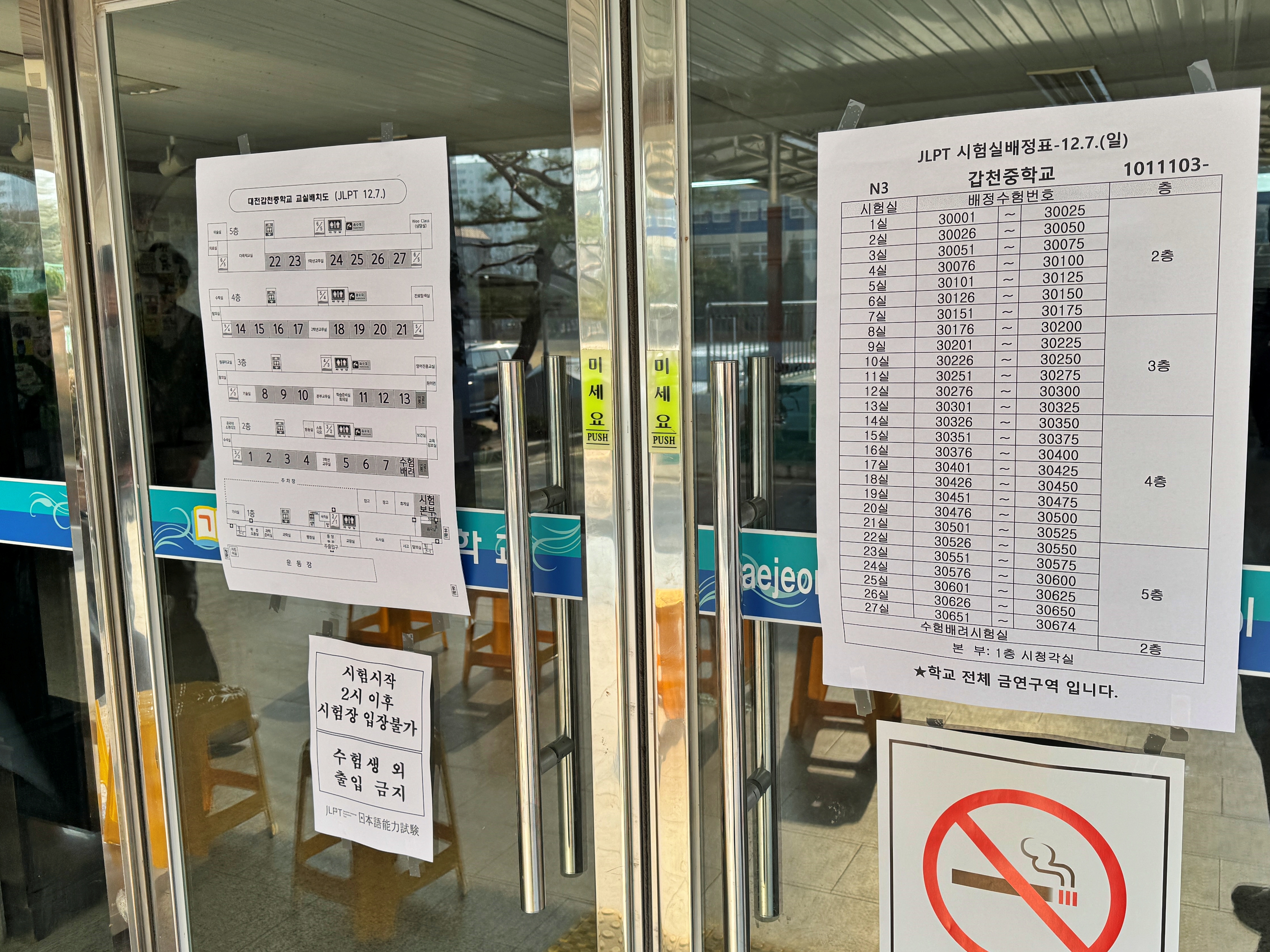 가끔 같은 시험장에 시험실만 다르고 다른 급수의 시험을 함께 치르는 경우도 존재하지만 이 시험장은 N3 응시자들로만 27개의 시험실을 채웠습니다.. 주된 응시생의 연령대는 10대 후반 20대 초반이긴 했지만 나이가 좀 있는 아주머니도 계시고 군인들도 좀 있었습니다.