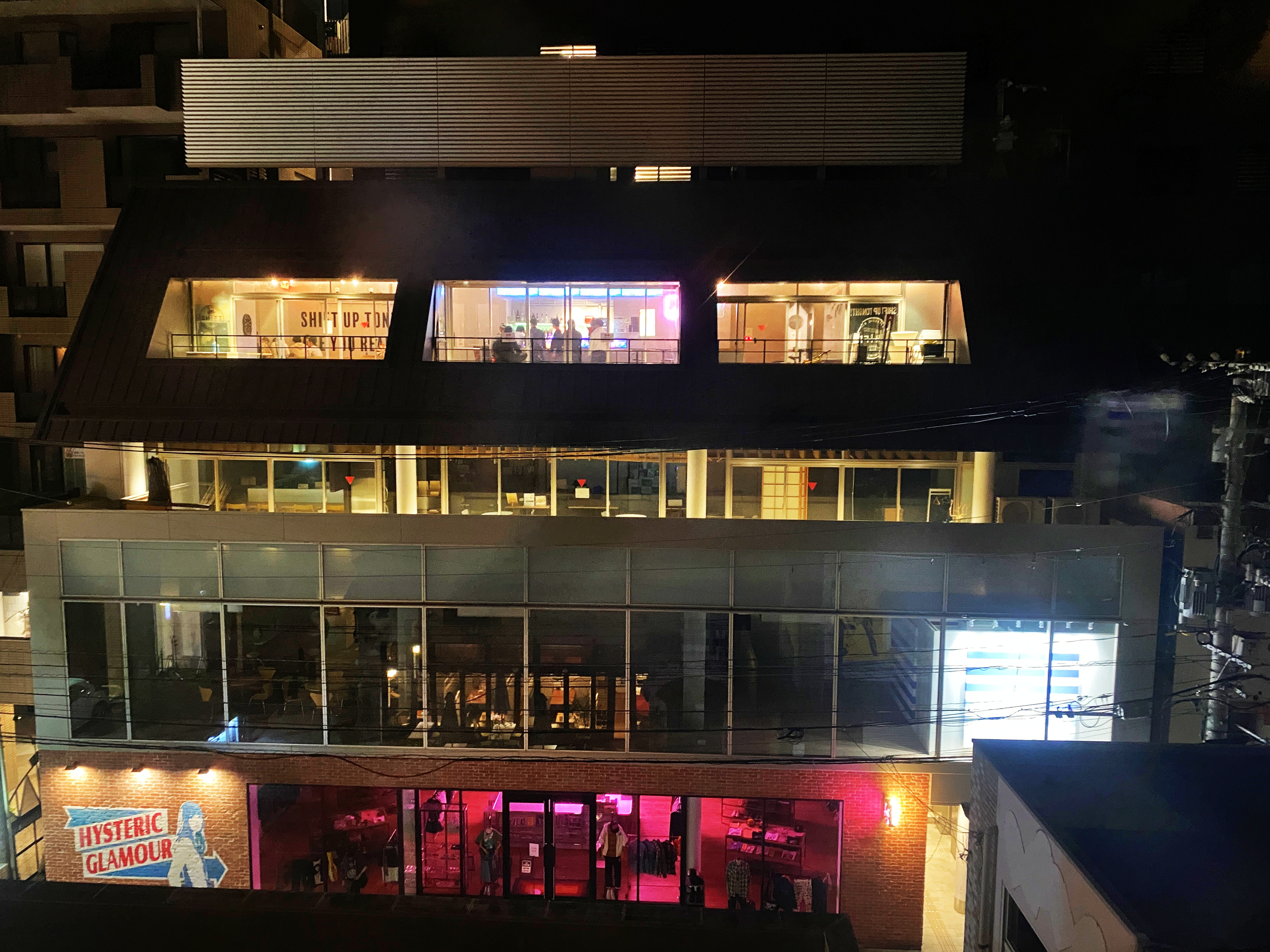 호텔 창문으로 보이는 4층 펍은 불야성입니다.
