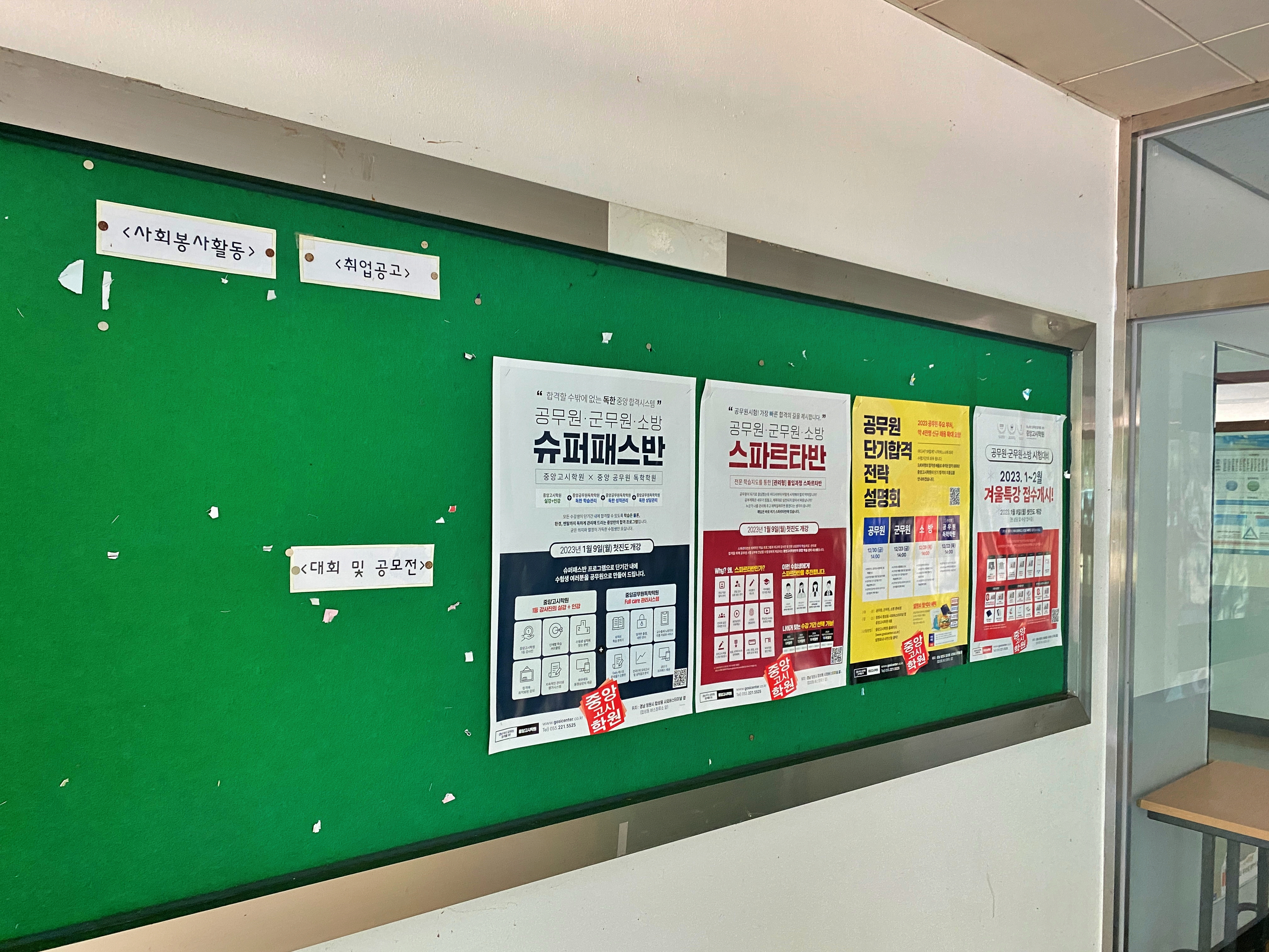 봉사활동이나 취업 대회 및 공모전에 관련된 게시물은 없었고, 창원의 한 공무원 학원 관련 게시물만 존재했습니다. 그래도 2023년 1월, 2월 특강과 관련된 내용도 있는 걸로 보아 비교적 최근에 부착한 게시물이 아닐까 싶더군요.
