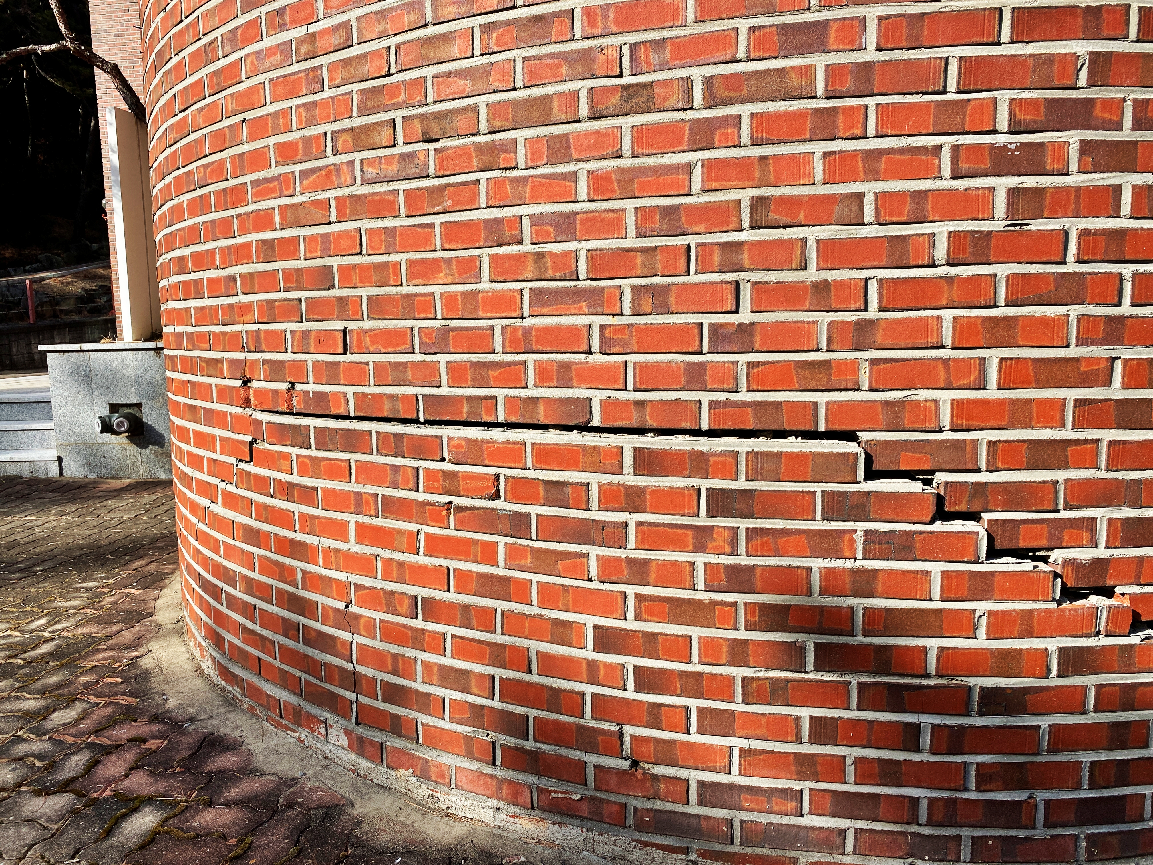 이전부터 벽돌로 마감된 건물들은 시간이 지나면 이렇게 벽이 갈라지는 모습들을 종종 보곤 했습니다. 예전에 성화대학의 경우 비슷하게 적벽돌로 마감한 외벽이 무너지기 직전까지 갔던 모습도 볼 수 있었지요. 전형적인 90년대에 유행하던 마감재입니다만, 요즘도 흔히 볼 수 있습니다.