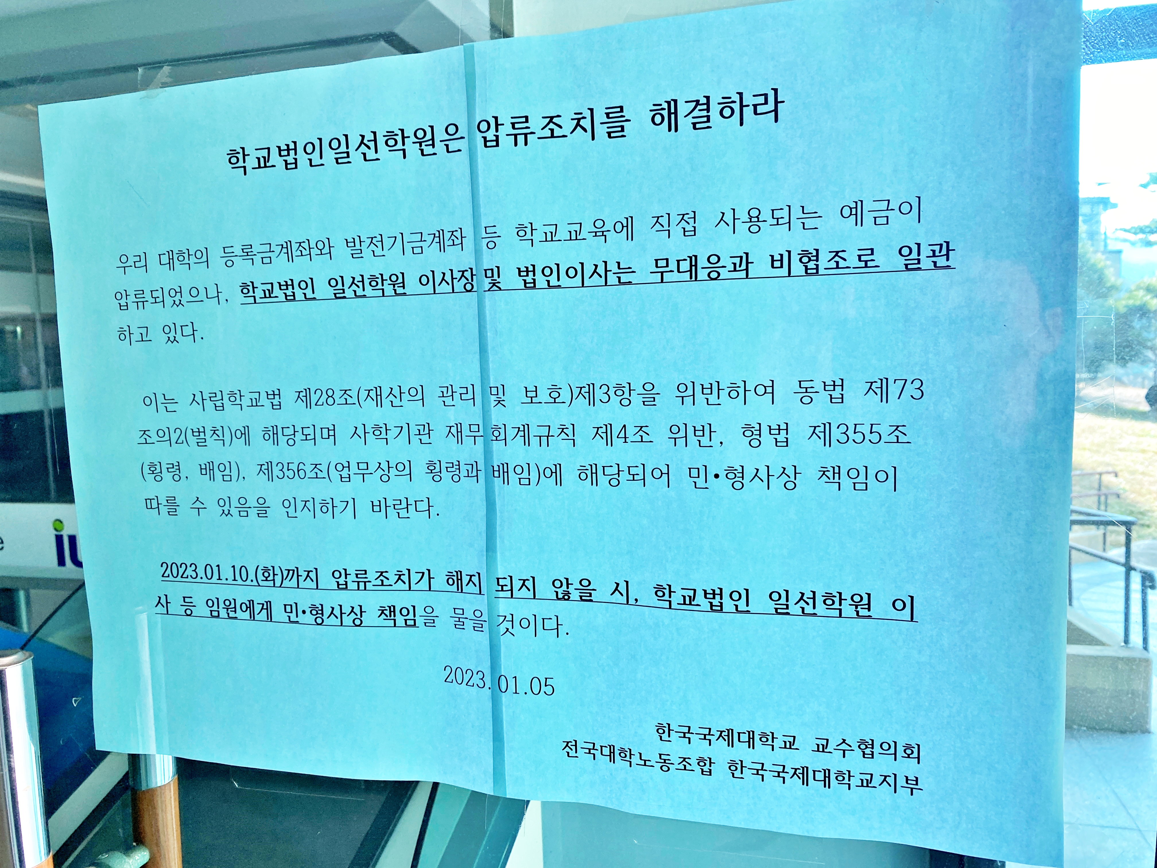 2023.01.10.(화)까지 압류조치가 해지되지 않을 시, 학교법인 일선학원 이사 등 임원에게 민·형사상 책임을 물을 것이다.