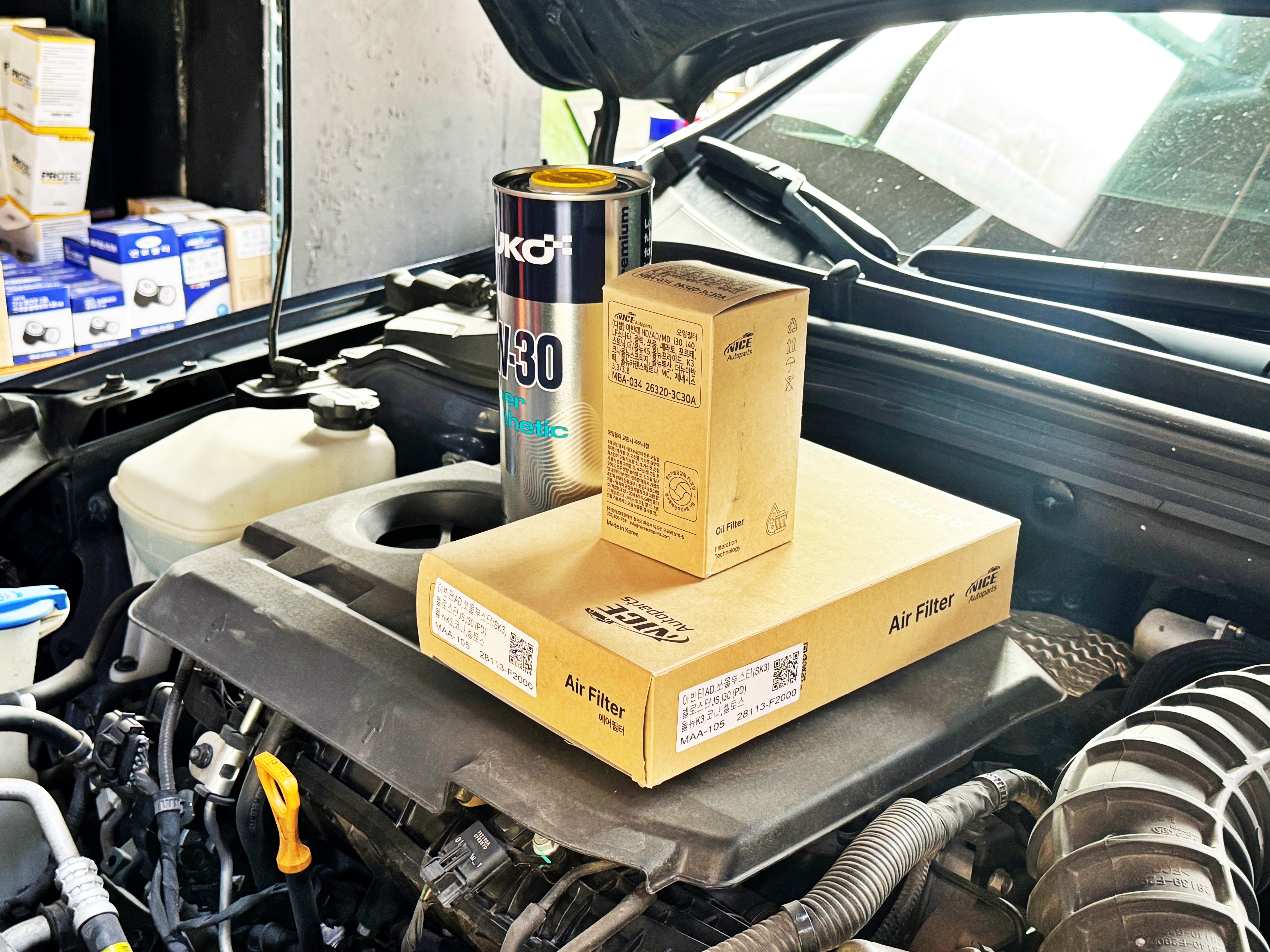 멀리서 보면 순정박스처럼 보였는데 필터는 나이스오토파츠제. 메이커에 필터를 OEM으로 납품하는 엠에프티코리아 제품이라고 합니다. 필터야 현대딱지 붙은 물건이나 제조사들이 자체 공급하는 제품들이나 사실상 큰 차이가 없기에 저렴한 제품이 장땡이긴 합니다.