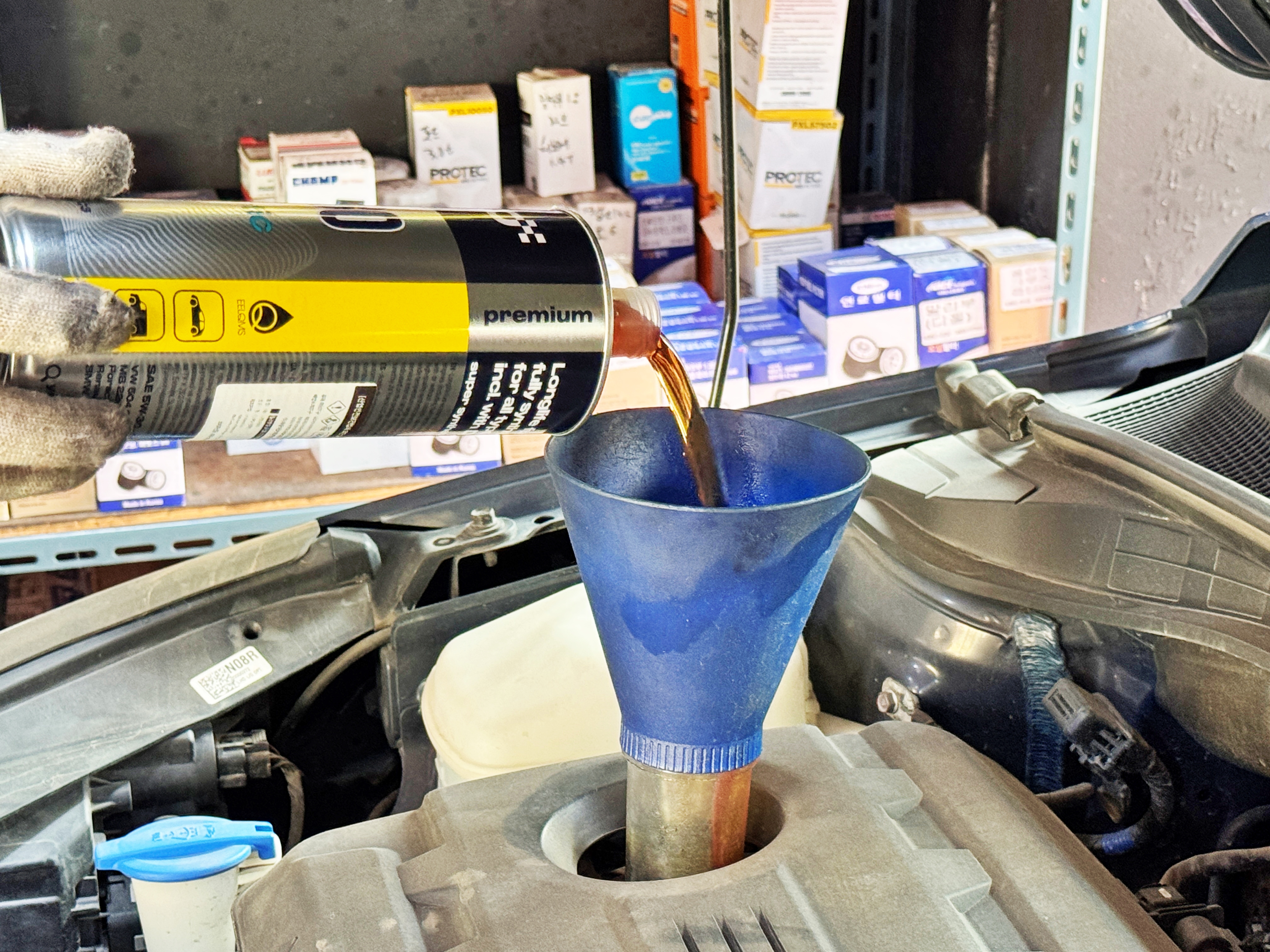 첨가제가 많이 들어간 오일일수록 마치 참기름처럼 색이 더 진해집니다. 이 우크라이나산 오일 역시 진한 참기름 색을 보여주네요. 어느정도 오일을 주입한 뒤 게이지를 확인합니다. 그냥 대강 집어넣고 작업의 마무리를 알려도 됩니다만, 디젤차량 특성상 필연적으로 DPF를 재생하다 보면 오일이 늘어날 수밖에 없는 이유를 설명하고 그 부분을 염두하여 주입량을 맞췄다며 게이지에 찍히는 오일의 양도 확인시켜 주셨습니다.