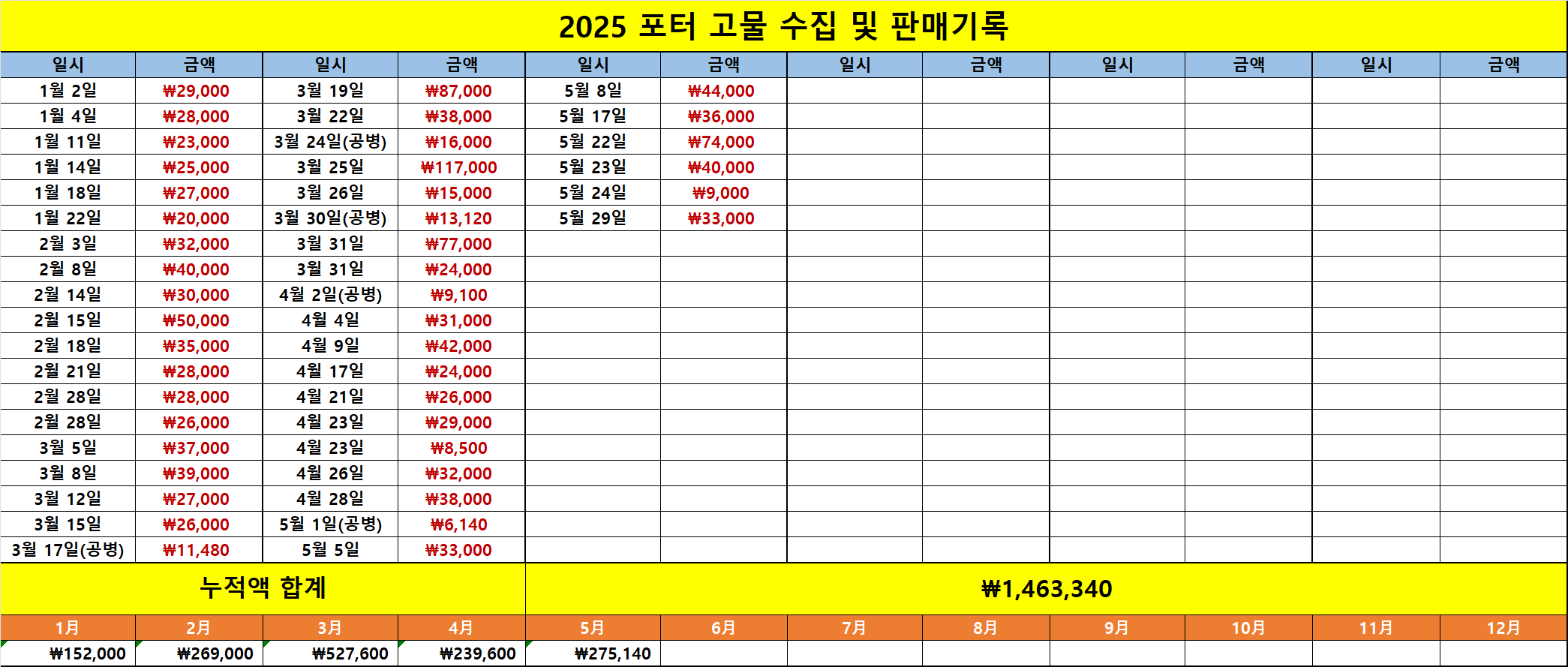 5월 초부터 연휴가 시작되고 중순에 내내 타이밍 나쁘게 비가 내리던 시기가 있었던지라 4월 대비 고물상에 다녀온 빈도는 줄었습니다만, 그래도 총 수익만 봐선 4월 대비 약 15% 늘어난 수치를 보여줬습니다. 중간에 한 컴퓨터 가게에서 가져온 폐 본체 20여대가 있어 4월 대비 수익률이 좋았네요.