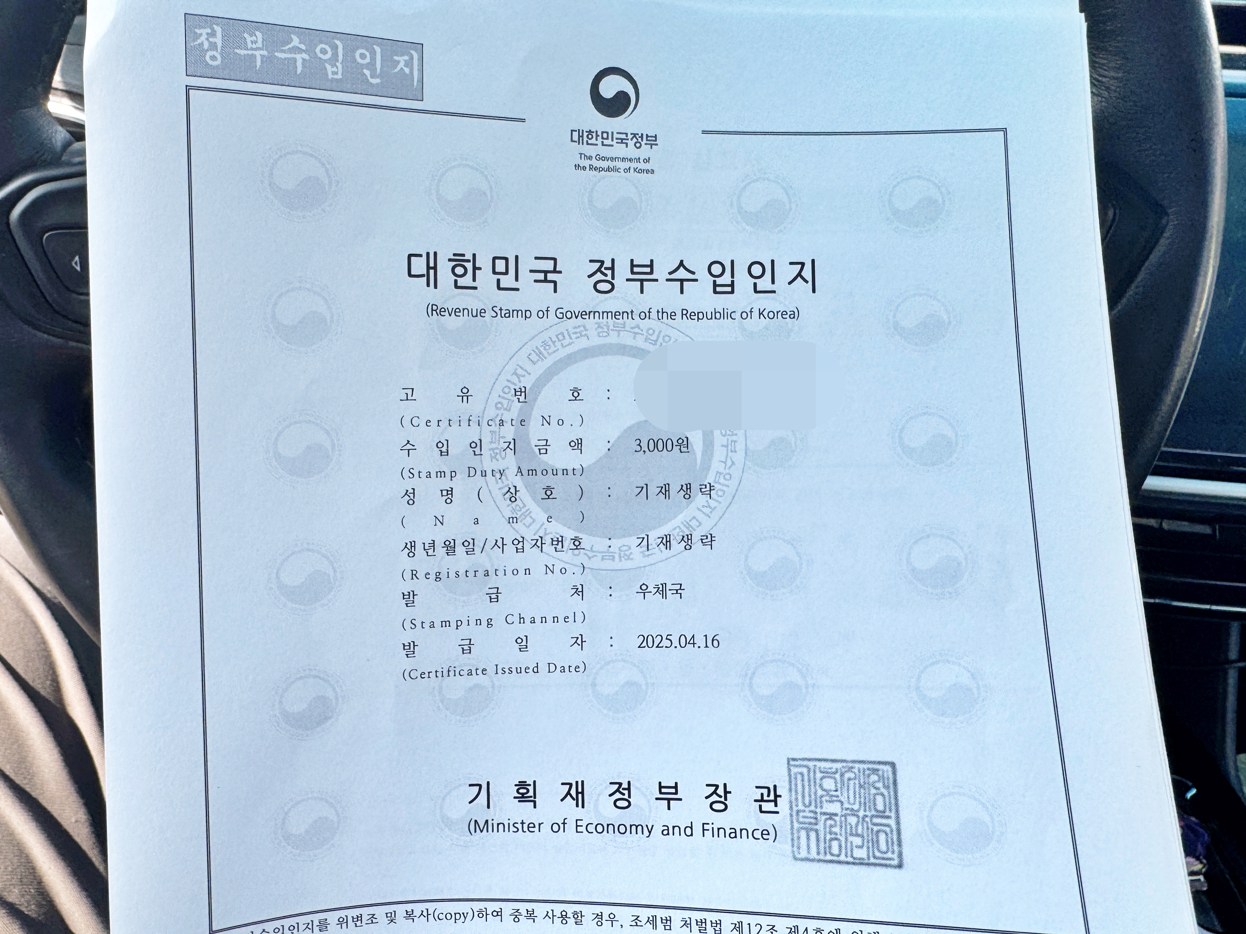 3,000원 짜리 수입인지가 필요합니다.