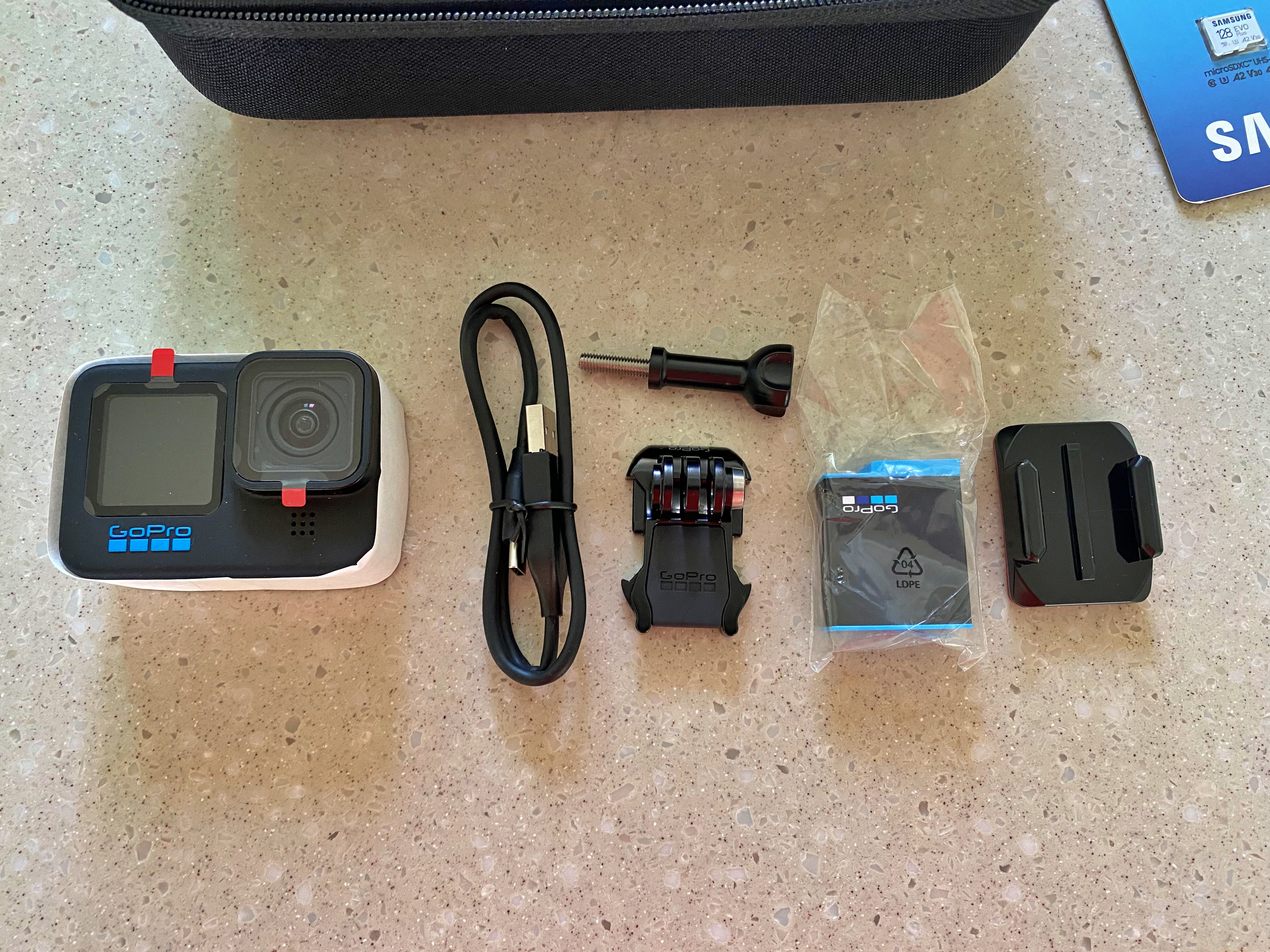 고프로 히어로 10 블랙 본체와 엔듀로 배터리 128GB 메모리카드가 전부입니다.
