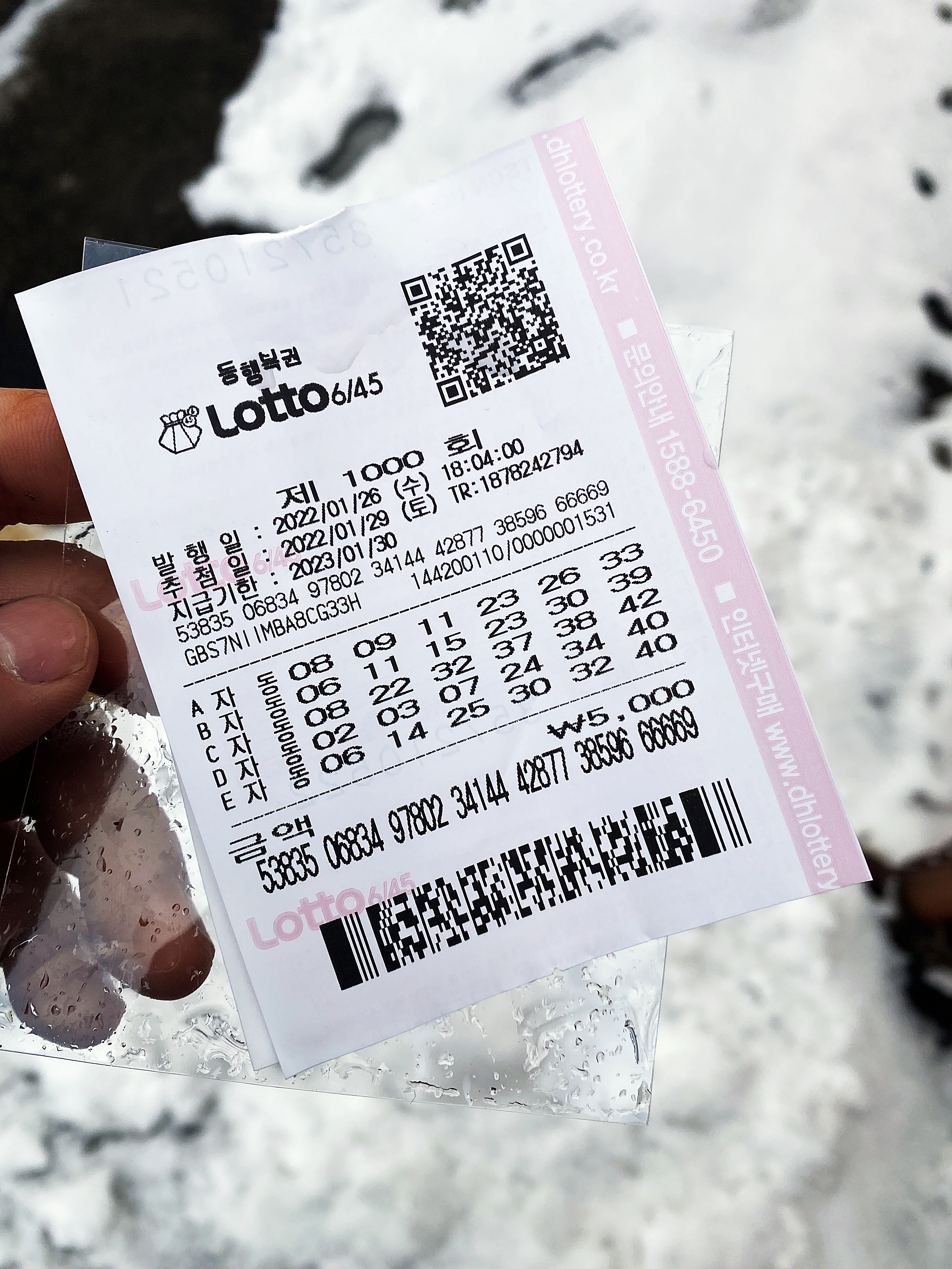 5등 5000원만 당첨되었어도 기분이 매우 좋았을텐데, 무려 4등 5만원에 당첨이 된 로또였습니다. 즉 누군가가 앞면만 보고 꽝이라고 생각하고 길거리에 버렸던 로또를 우연히 주워 확인했더니 4등이네요. 양력과 음력 모두 2022년에 접어드는 시점에서 시작이 매우 좋습니다.