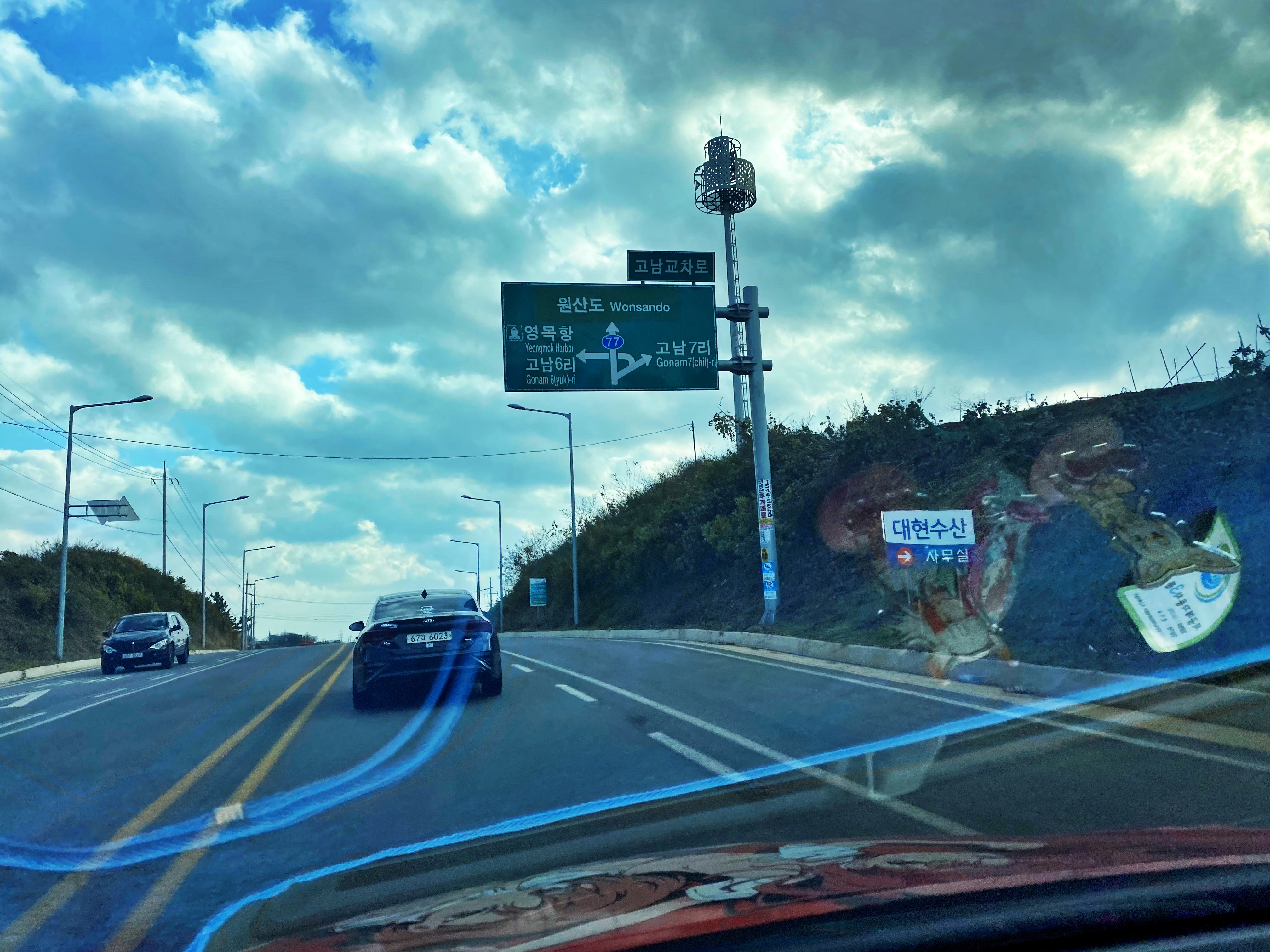 고남을 지나면 영목항. 영목항 즈음부터 원산도로 연결되는 도로가 건설되어 왕복 4차선으로 차선이 늘어납니다. 그 전까지 이런 왕복 2차선 도로를 타고 가야 합니다. 멀리 보면 차량 통행량이 많다는 사실을 알 수 있지요.