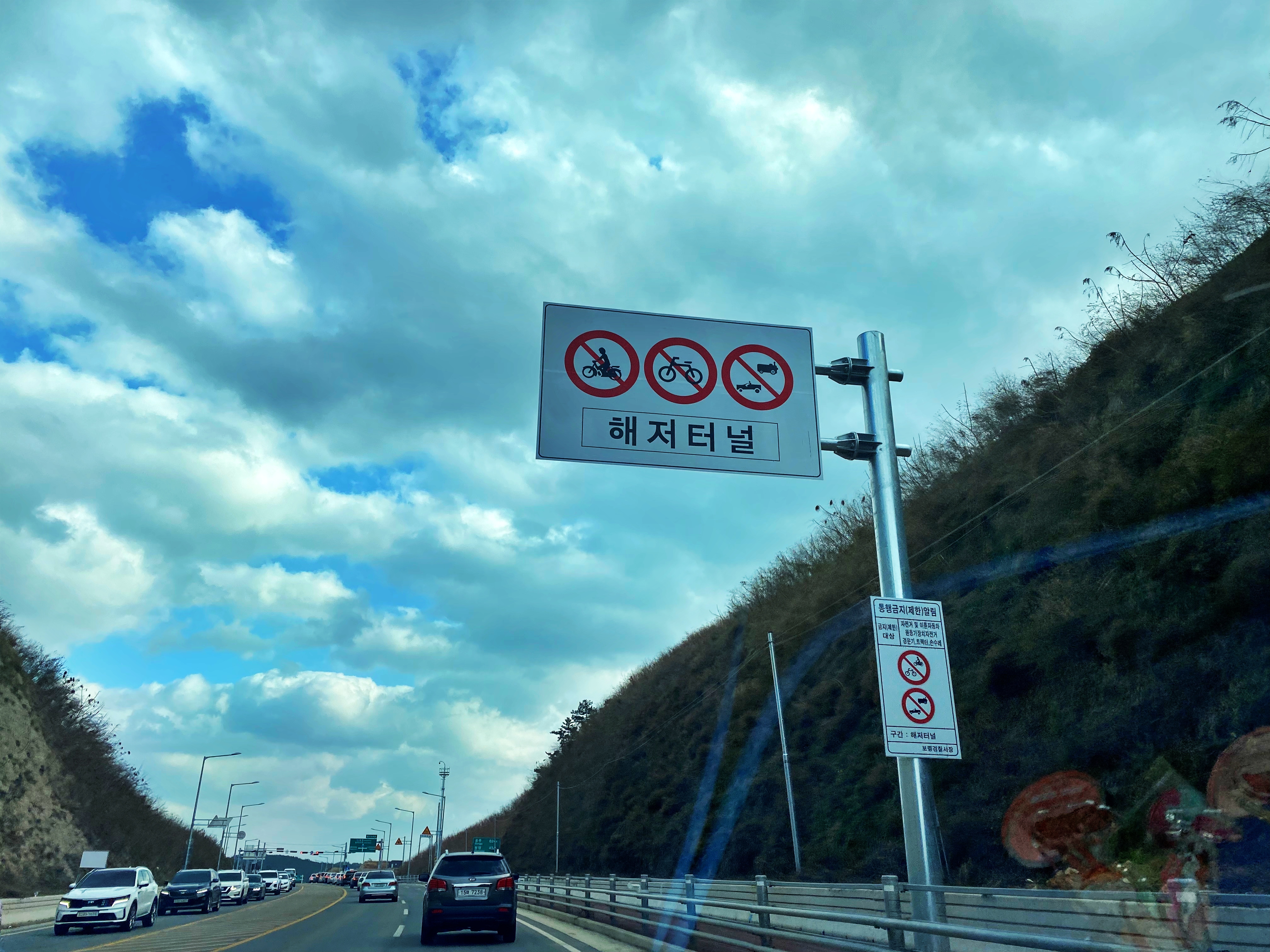 해저터널을 앞두고 통행금지 표지판이 보입니다.