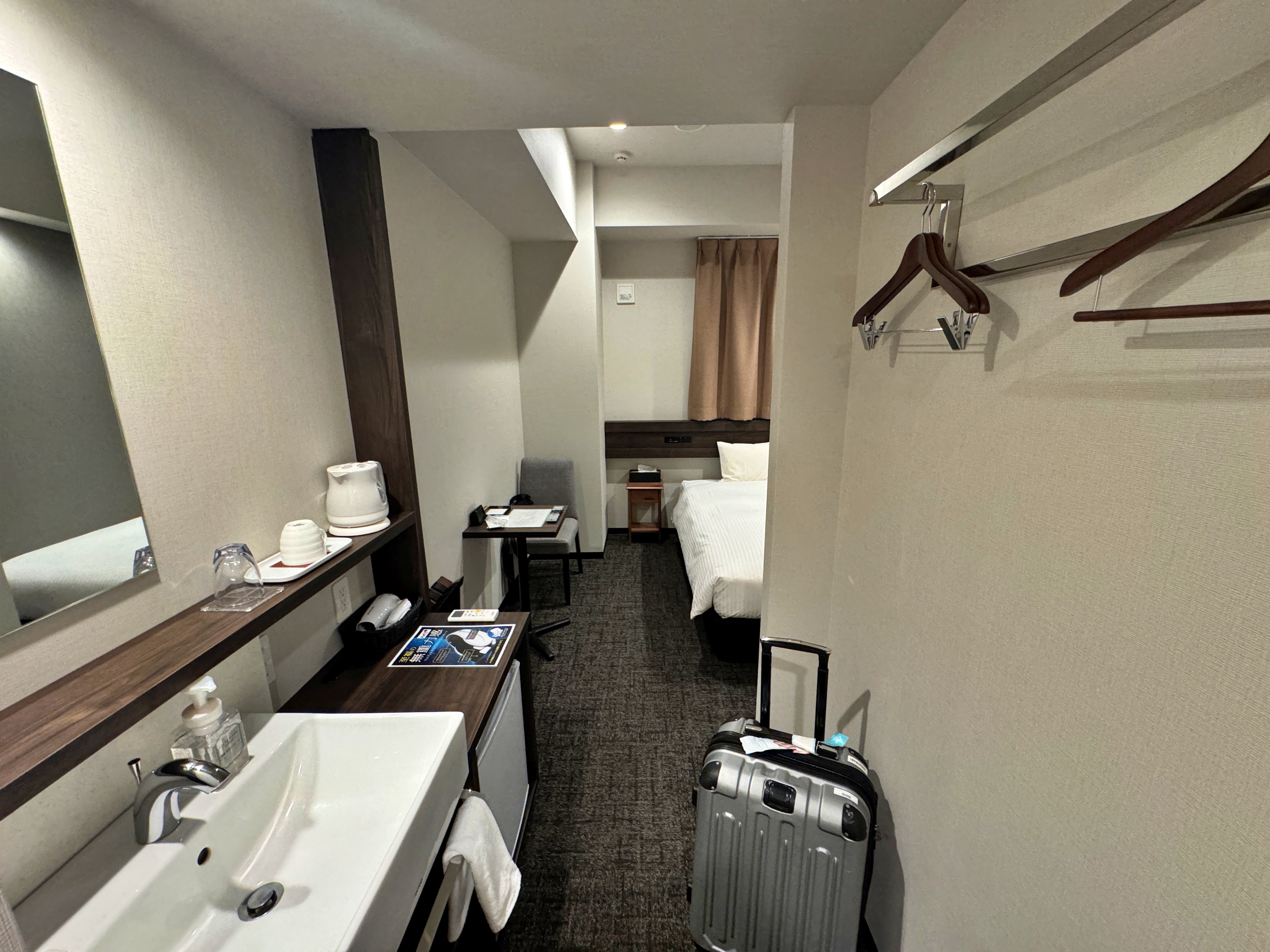 최근에 지어진 비지니스호텔답게 상당히 깔끔한 시설에 스마트 TV까지 벽걸이로 걸려있었습니다. 아침에 일어나서 본 객실 뷰는 뒤의 맨션들이 보이는 수준이었지만, 비즈니스호텔에 뷰를 바라는 건 사치지요.