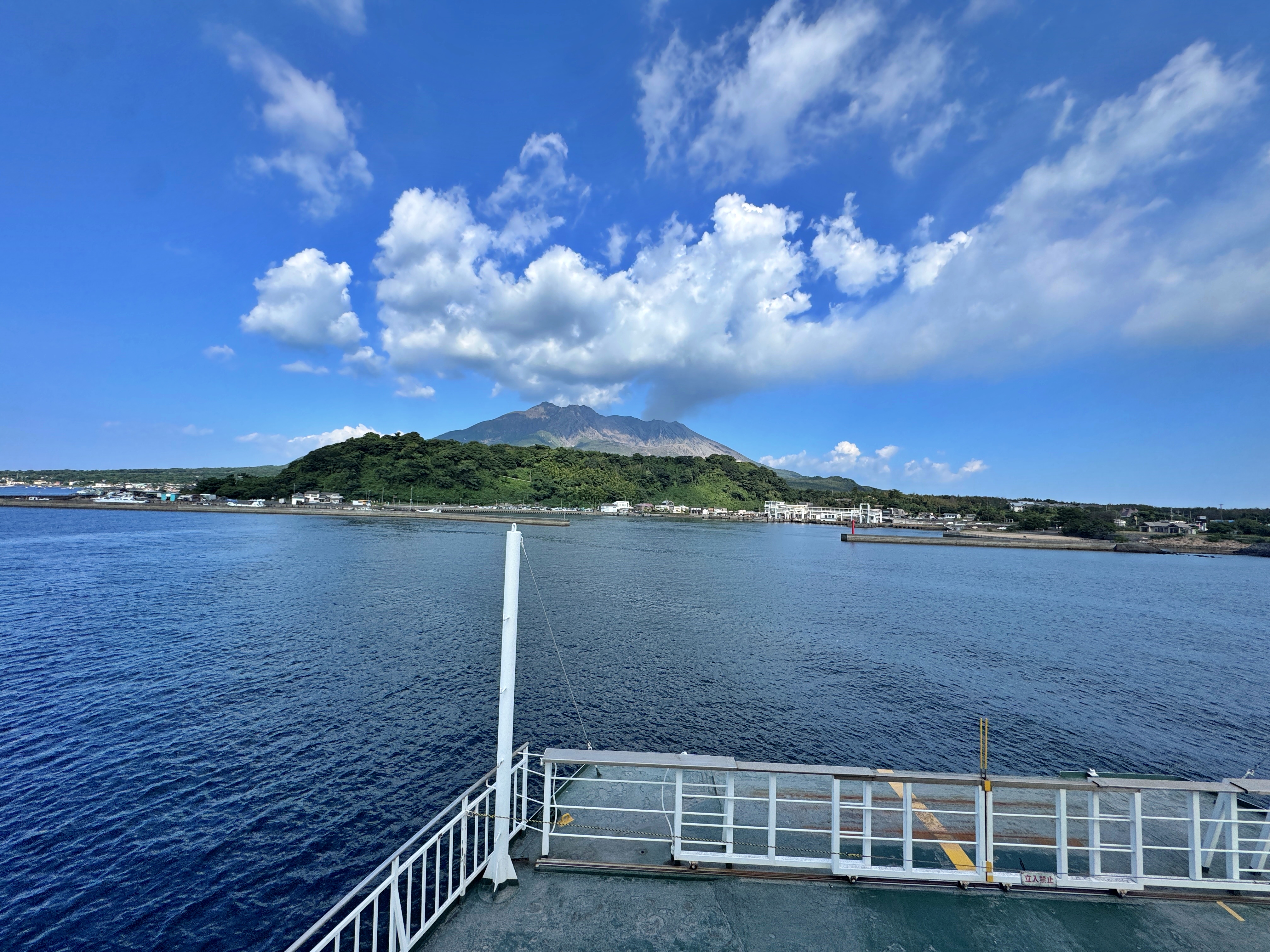 저 뒤로도 또 한 대 들어오고 있습니다. 그렇게 잠시 배에서 시간을 보내니 금방 사쿠라지마가 눈앞에 보입니다.