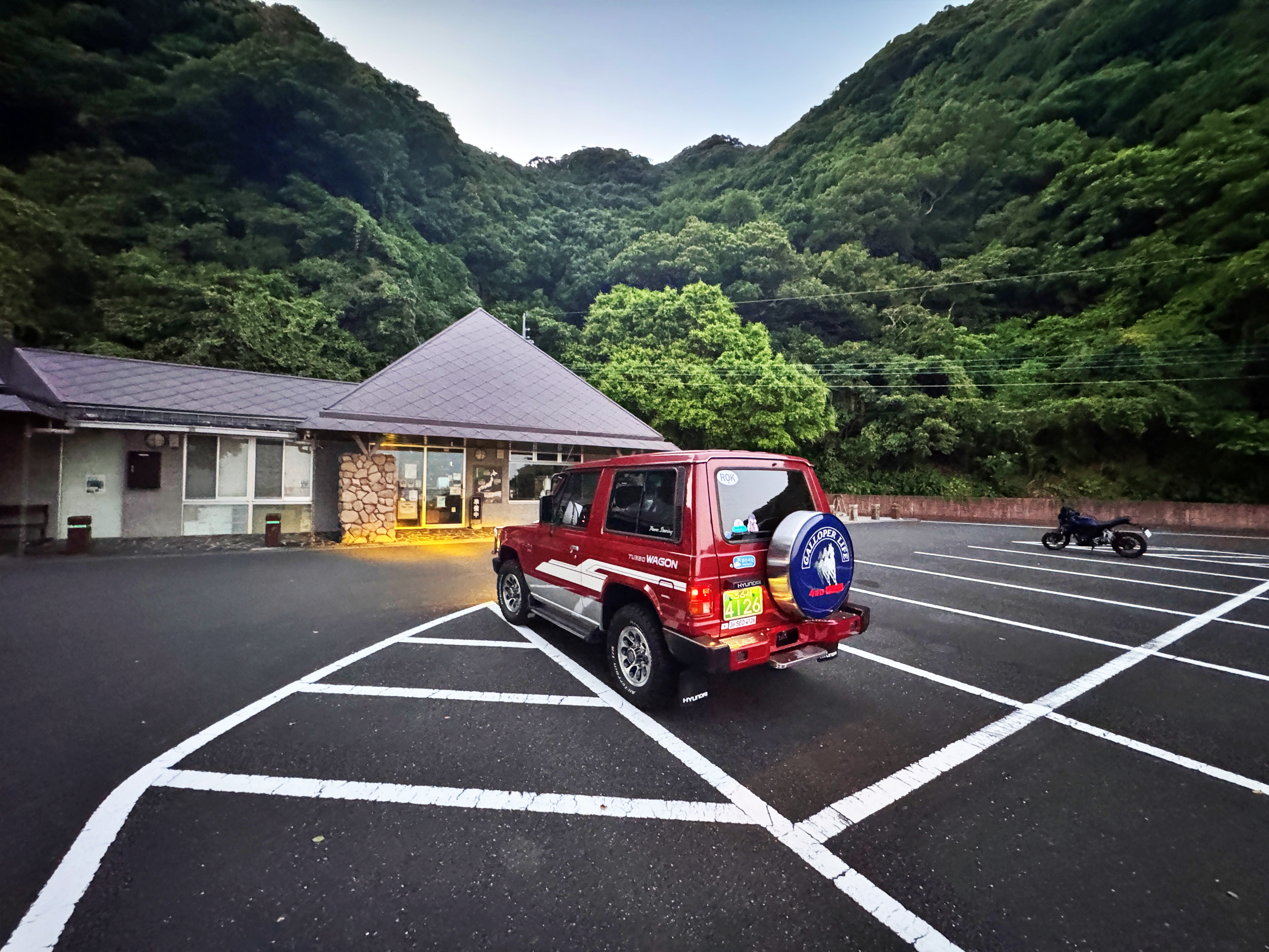 이전에 일시반출입으로 왔던 갤로퍼들이 이 곳을 다녀갔다는 자료가 없으니 갤로퍼로서는 최초가 아닐까 생각되네요. 저 옆에 오토바이. 미야자키 번호판이었는데, 먼저 내려갔으나 중간에 제 뒤로 붙더군요. 그렇게 때 한참을 같이 달려왔던지라 아직도 기억에 남습니다.