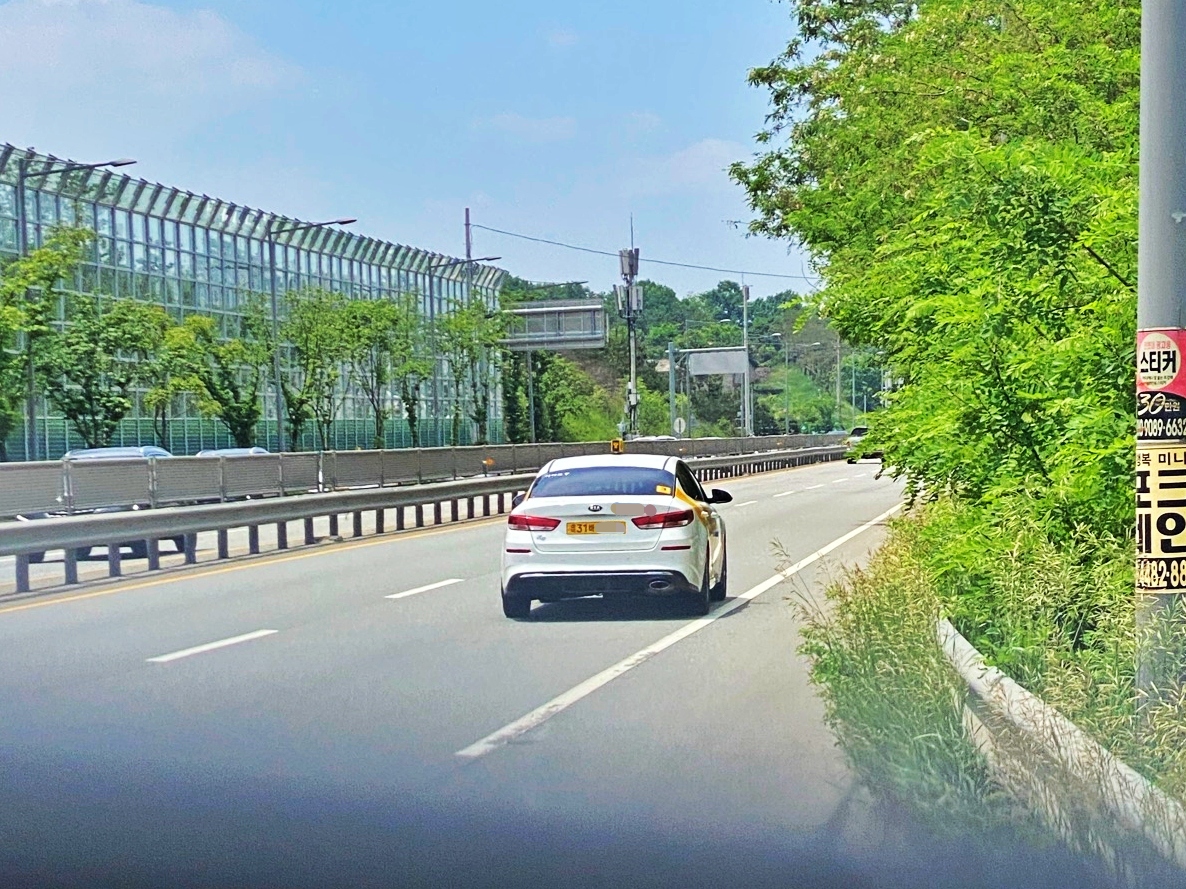 카카오T 앱을 실행하여 위치를 찍고 기다리니 곧바로 카카오 T 블루 가맹점인 법인회사의 K5 택시가 배차되었습니다. 먼저 탑승해있던 승객을 내려준 뒤 제가 있는 도로로 달려오는 모습이 앱에 보이더군요. 그렇게 조금 기다리니 택시가 모습을 드러냅니다. 손을 흔들어 예약한 손님임을 알렸고 택시는 제 앞에 정차했습니다.