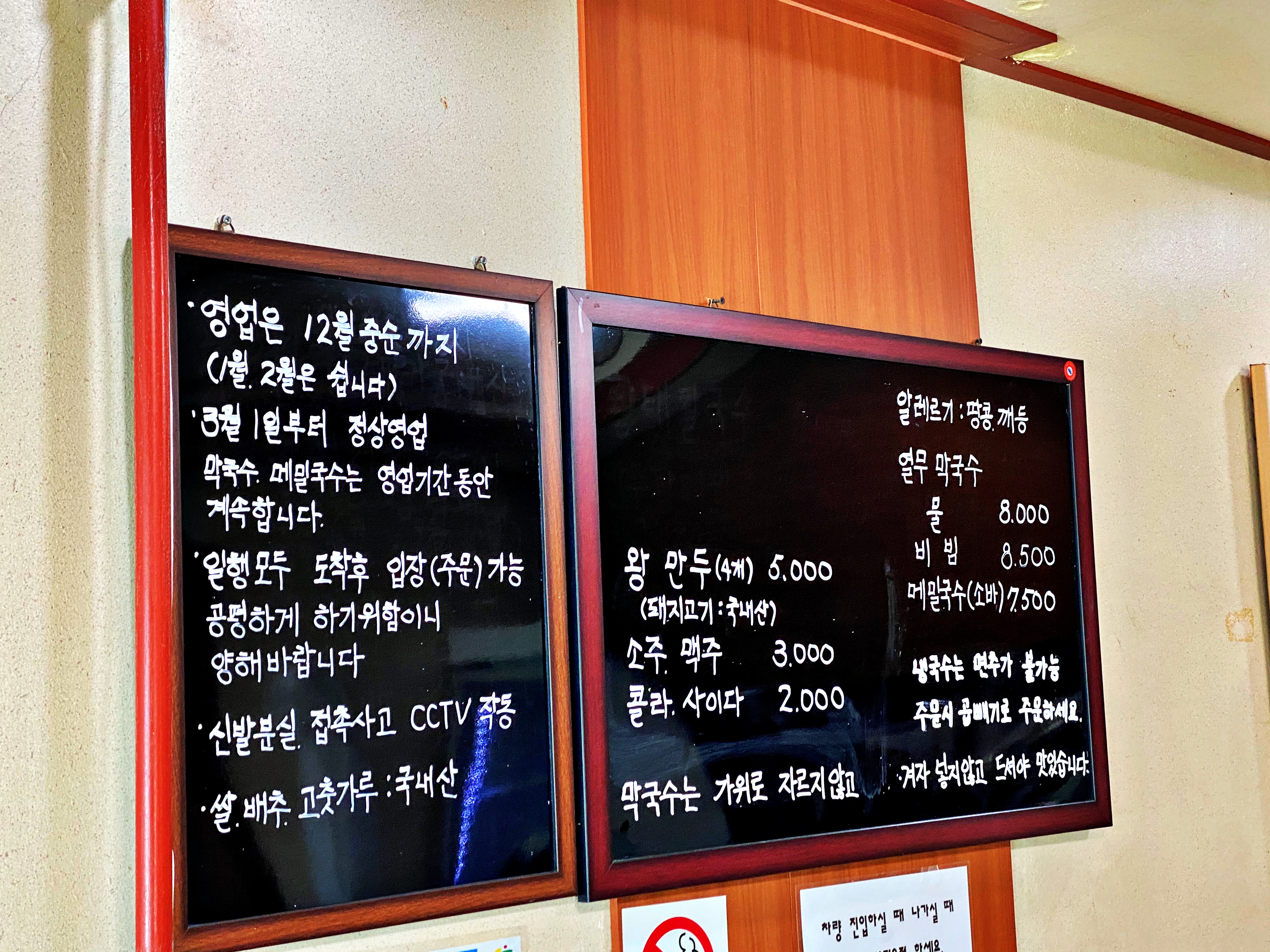 물론 9월부터 12월 중순까지 칼국수를 막국수와 병행하여 판매하기는 합니다만, 1월과 2월에는 영업을 하지 않고 3월부터 막국수를 판매한다고 합니다. 즉 상호는 칼국수집이지만, 칼국수는 두달 반 겨우 판매하고 막국수는 영업기간 내내 판매한다고 합니다. 상호는 황태칼국수인데, 정작 메인메뉴는 막국수입니다.