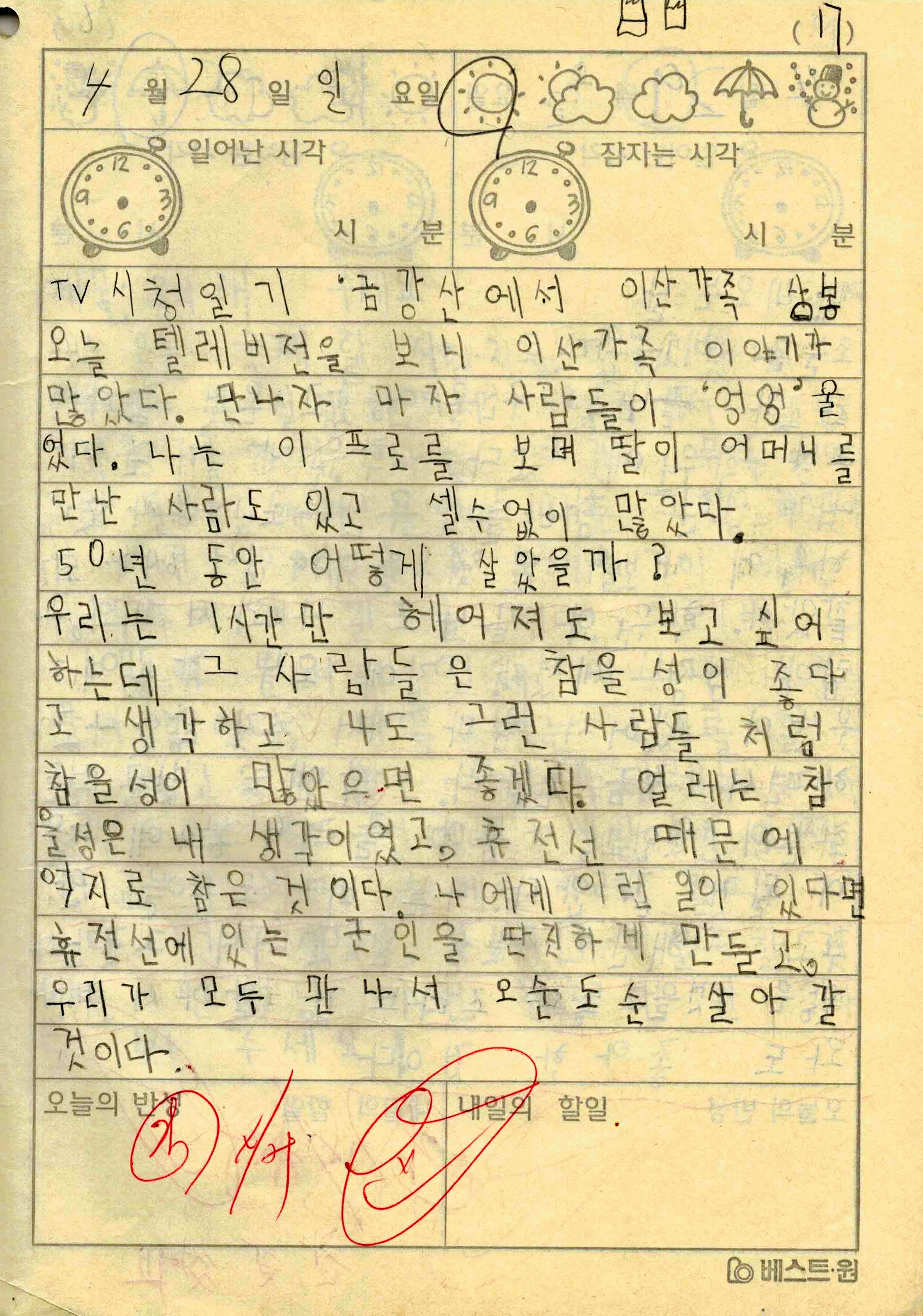 오랜만에 초딩일기를 가지고 와 봤습니다. 'TV 시청일기'라는 주제로 TV를 시청하고 소감문을 작성해오는 형태의 일기를 써서 학교에 갔던 것으로 기억하는데, 그 내용 중 하나네요. 당시 금강산에서 진행하던 남북 이산가족 상봉 행사를 시청했던 내용입니다.