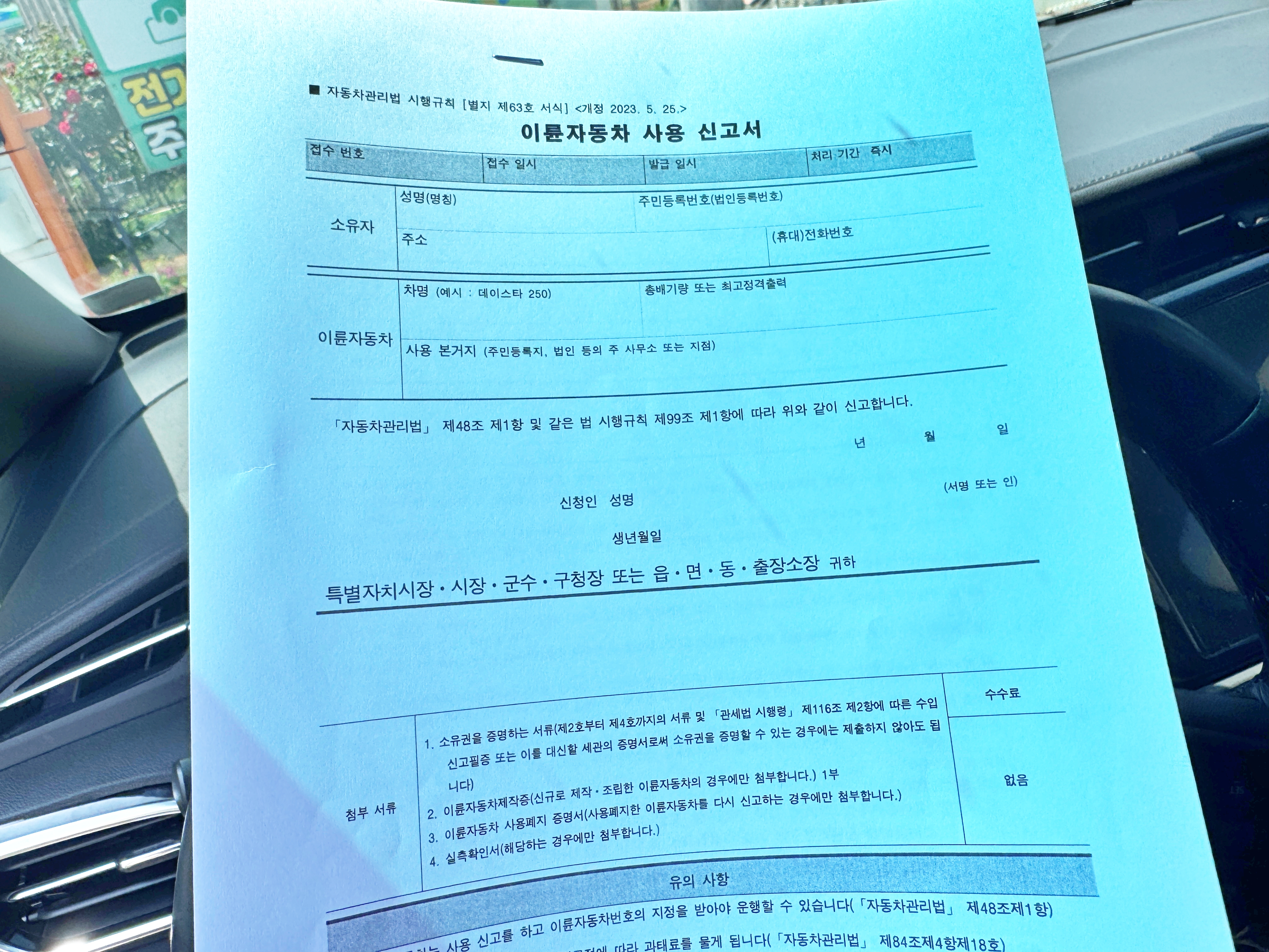 사무실에서 가까운 석문면행정복지센터에 방문하여 이륜자동차 사용 신고를 진행합니다.